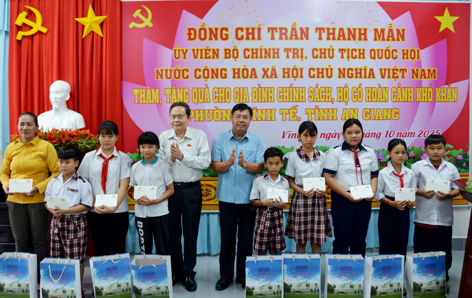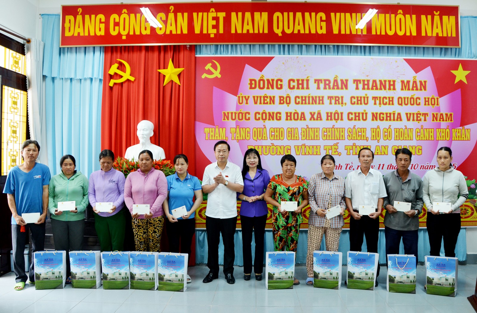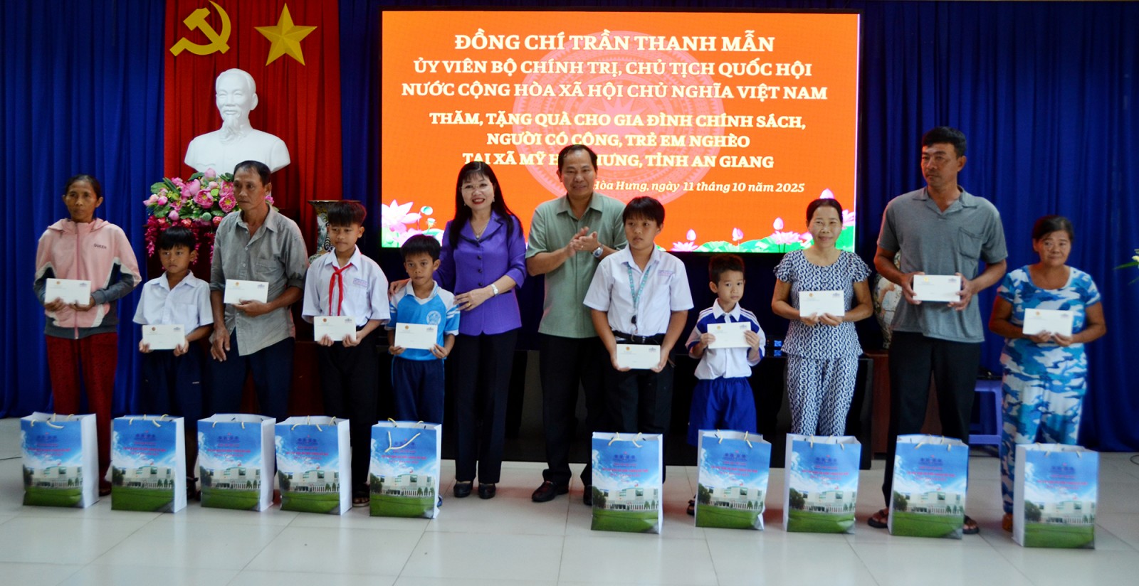 Dịp này, Chủ tịch Quốc hội Trần Thanh Mẫn trao 200 phần quà cho gia đình chính sách, người có công, trẻ em nghèo trên địa bàn xã Mỹ Hòa Hưng, hai phường Vĩnh Tế và Châu Đốc.