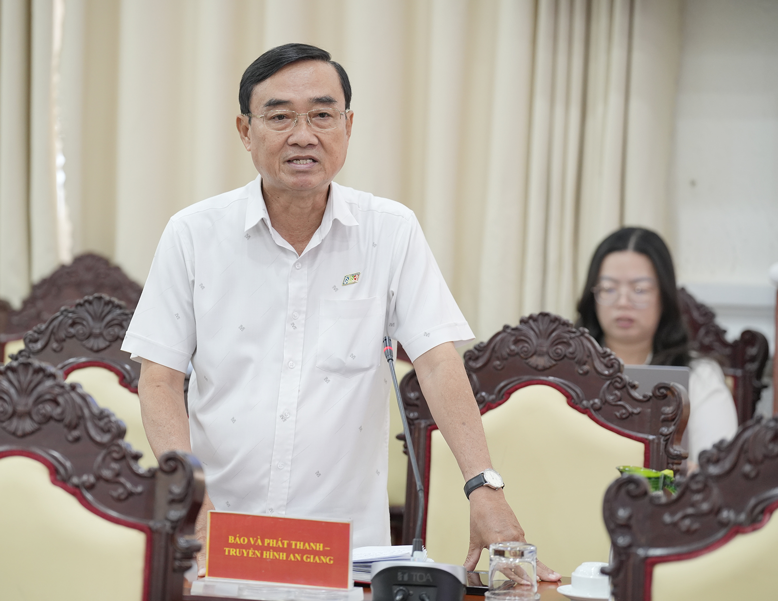 Phó Giám đốc Báo và Phát thanh - Truyền hình tỉnh An Giang Đỗ Quốc Bửu phát biểu tại cuộc họp.