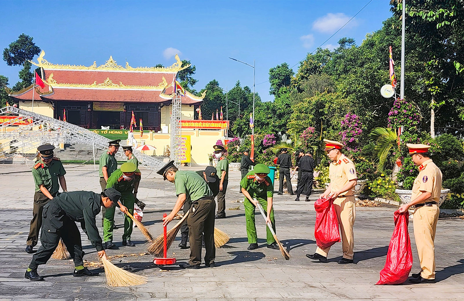 Sau lễ dâng hương, các cán bộ, chiến sĩ Công an tỉnh và địa phương tham gia tổng vệ sinh khu vực Đền thờ Quốc Tổ Hùng Vương và tuyên truyền phòng, chống ma túy đến người dân trên địa bàn, góp phần nâng cao ý thức chấp hành pháp luật trong cộng đồng.