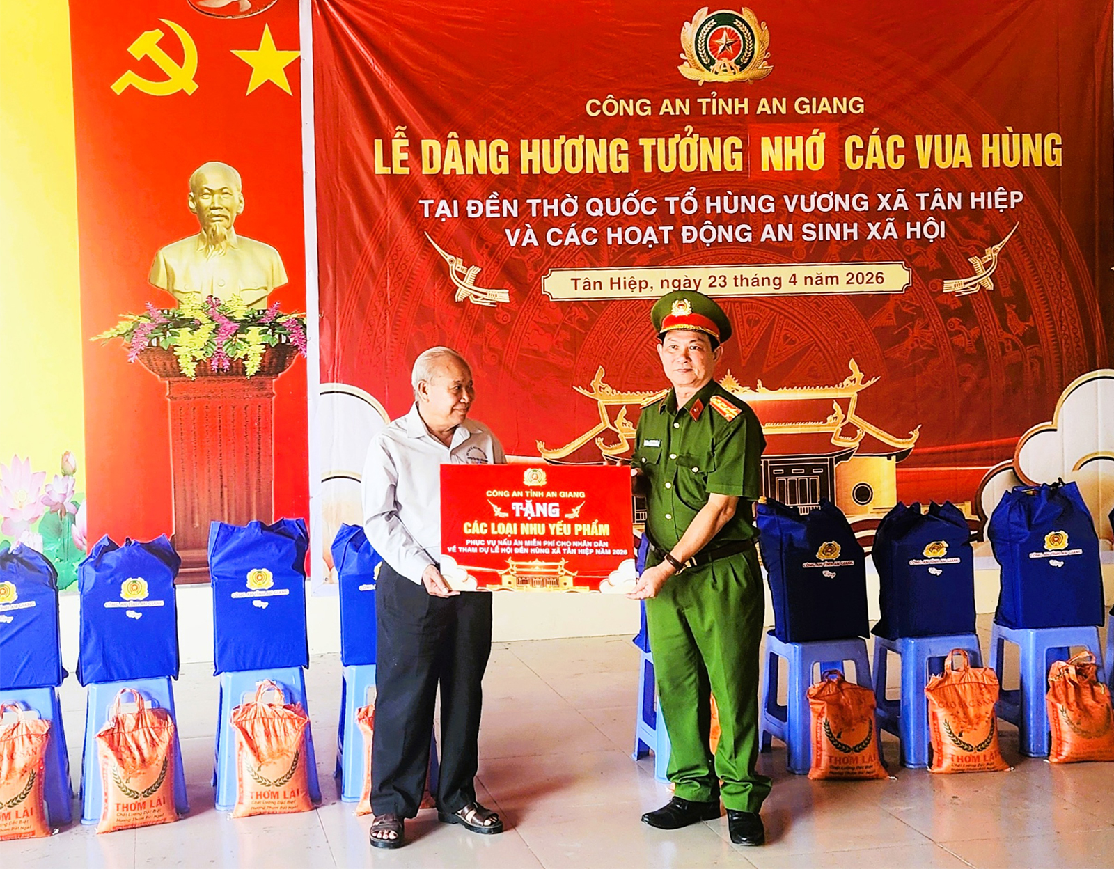 Dịp này, Đảng ủy, Ban Giám đốc Công an tỉnh trao tặng 30 suất quà cho những hộ có hoàn cảnh khó khăn trên địa bàn xã, mỗi suất trị giá 400.000 đồng; trao các loại nhu yếu phẩm để cùng Ban Bảo vệ Đền thờ phục vụ nấu ăn cho du khách đến tham dự các hoạt động tại đây.