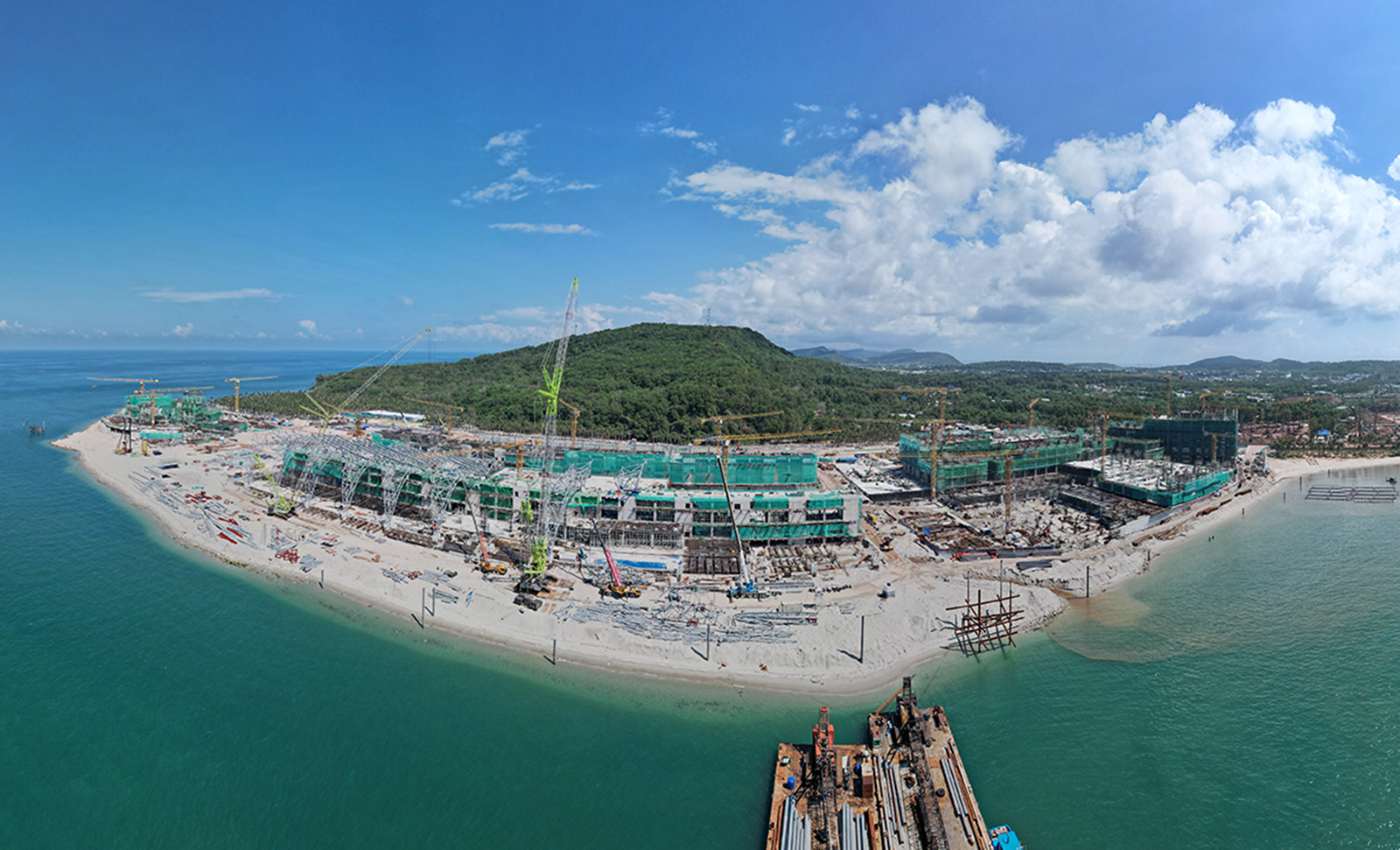 Không khí thi công tại Trung tâm Hội nghị và Triển lãm APEC khẩn trương khi dự án đã hoàn thành hơn 90% kết cấu bê tông cốt thép. Không gian hội nghị vượt nhịp 81m không cột - quy mô hàng đầu thế giới, đang từng bước được hiện thực hóa. Nhà biểu diễn đa năng đạt khoảng 85% khối lượng, hướng tới hoàn thiện toàn bộ vào đầu năm 2027.