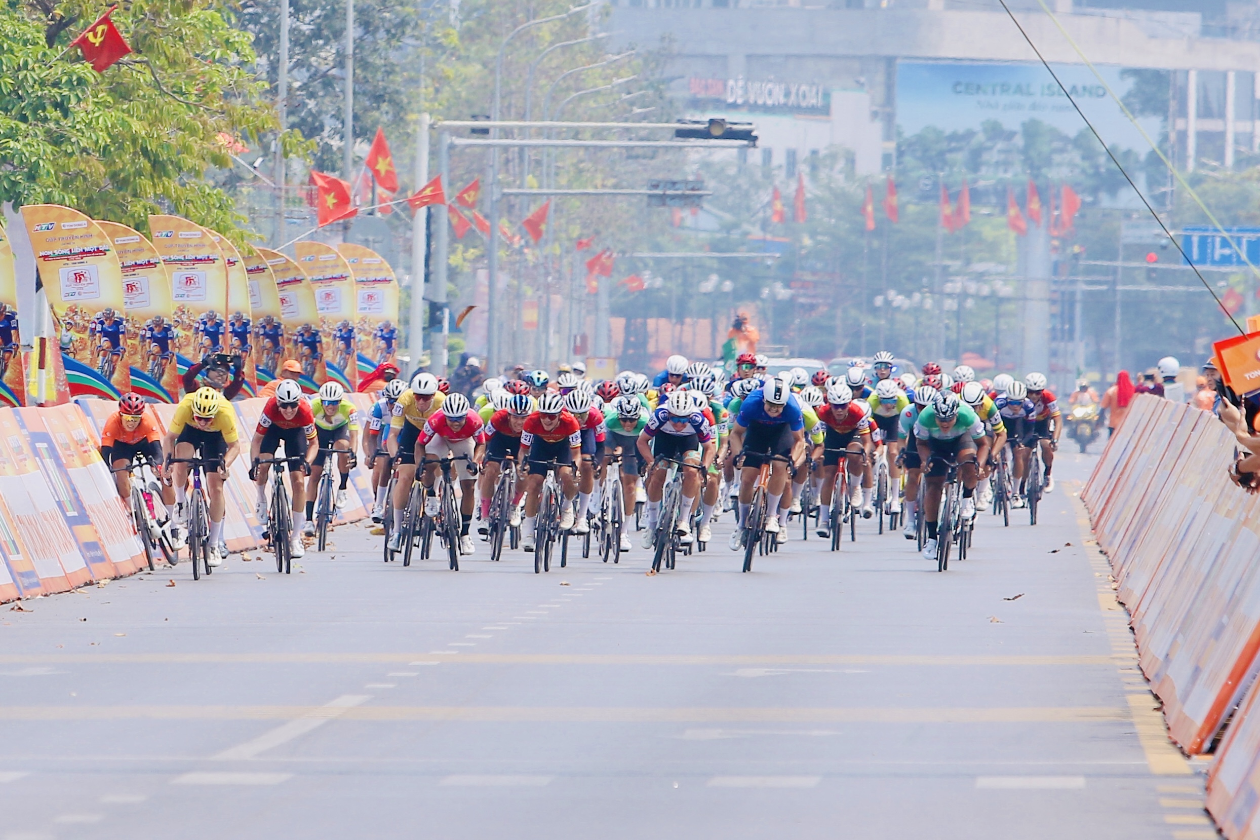 Các tay đua tranh tài chặng 5 Cúp xe đạp truyền hình TP.HCM từ Thanh Hóa đi Nghệ An. ẢNH: KHẢ HÒA