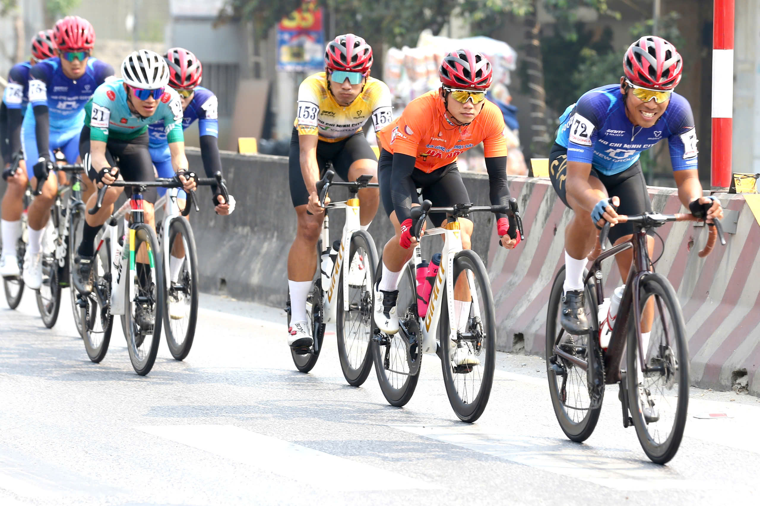 Tay đua Nguyễn Văn Bình (ngoài cùng bên trái) không may té ngã trong lúc cạnh tranh nước rút về đích chặng 5. ẢNH: HOÀNG HÙNG