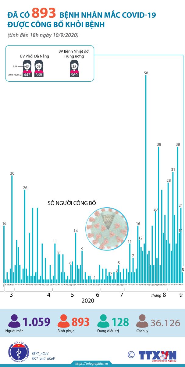 Tính đến 18h ngày 10-9-2020, đã có 893 bệnh nhân mắc COVID-19 được công bố khỏi bệnh.