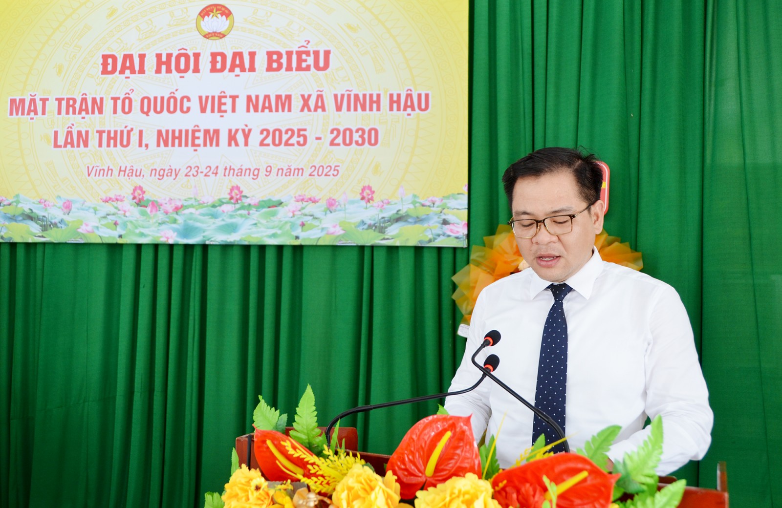 Phát biểu chỉ đạo tại đại hội, thay mặt Ban Thường trực Ủy ban MTTQ Việt Nam tỉnh, Phó Chủ tịch Ủy ban MTTQ Việt Nam tỉnh, Bí thư Tỉnh đoàn An Giang Phan Duy Bằng ghi nhận, biểu dương những thành tích mà MTTQ xã Vĩnh Hậu đã đạt được trong thời gian qua. Đồng thời, đề nghị thường xuyên cụ thể hóa và thực hiện kịp thời các chỉ đạo của Trung ương, của tỉnh, Đảng bộ xã, đảm bảo mặt trận phối hợp hiệu quả cùng cấp ủy, chính quyền, góp phần hoàn thành nhiệm vụ chính trị và tổ chức bộ máy tinh gọn mà Đại hội Đảng bộ xã Vĩnh Hậu đề ra.
