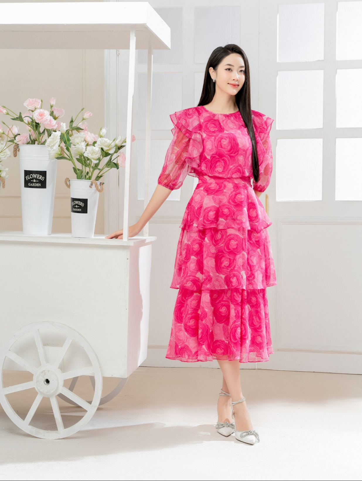 Ở một phiên bản rực rỡ hơn, bạn có thể chọn đầm bèo đa tầng tông hồng đậm với họa tiết hoa hồng in chìm sang trọng. ẢNH: EMSPO