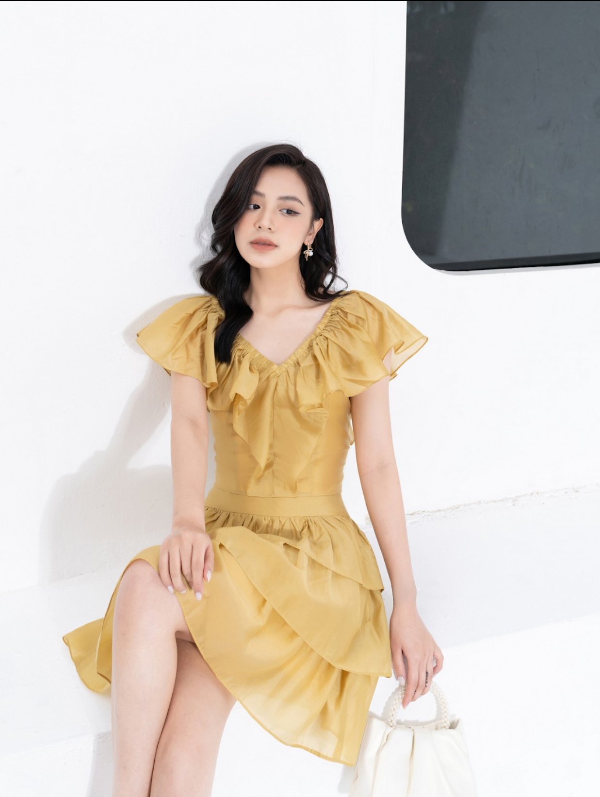Nàng cũng có thể chọn cho mình chiếc đầm bèo đa tầng ngắn trên gối, với tông màu vàng mù tạt nổi bật và chất lụa mỏng nhẹ. ẢNH: HERADG