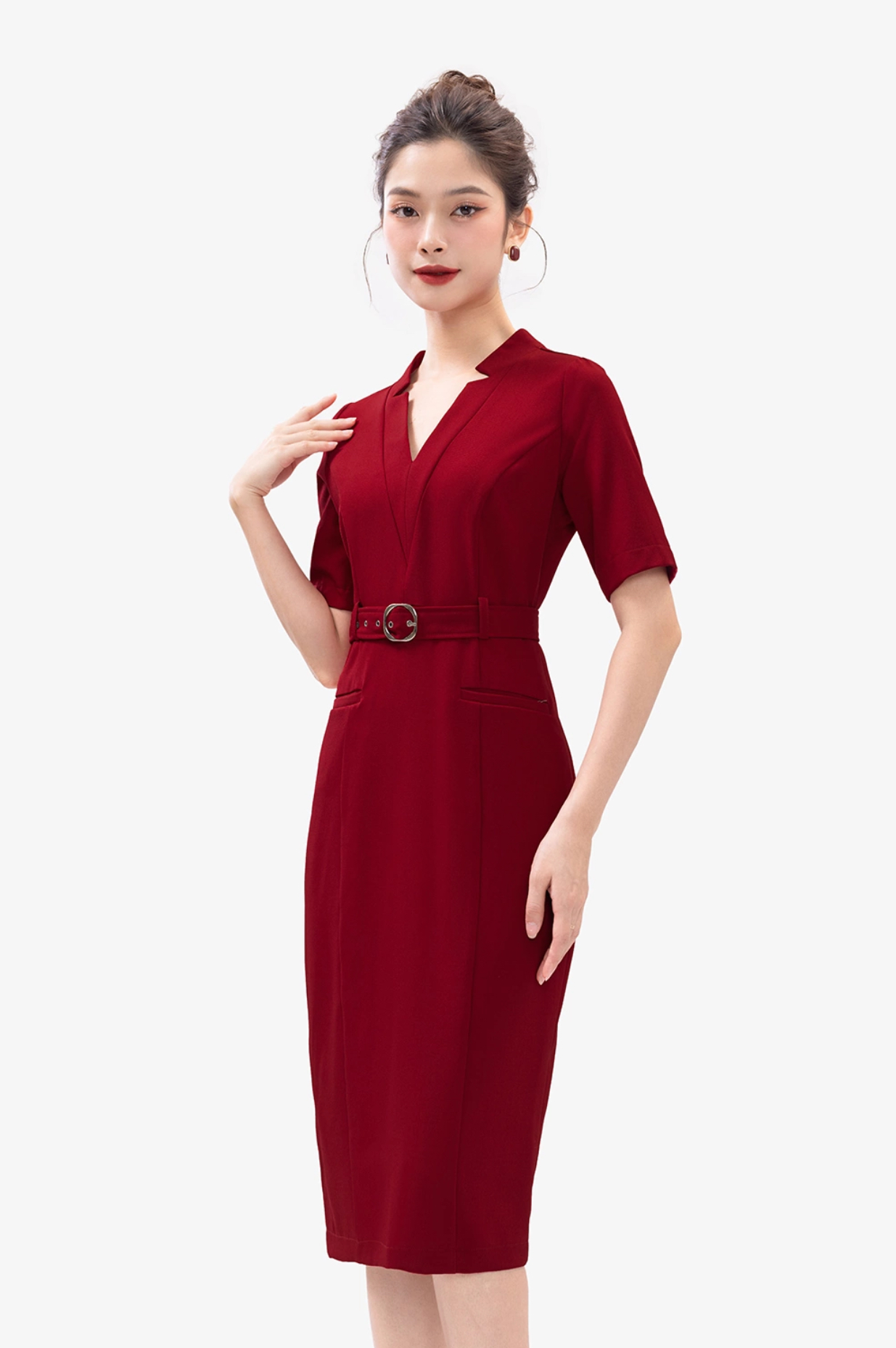 Đầm ôm vừa vặn màu đỏ đô trầm, thiết kế cổ chữ V sâu kéo dài đường cổ, trong khi tay ngắn giữ vẻ thanh lịch chuẩn mực nơi công sở. ẢNH: K&K FASHION
