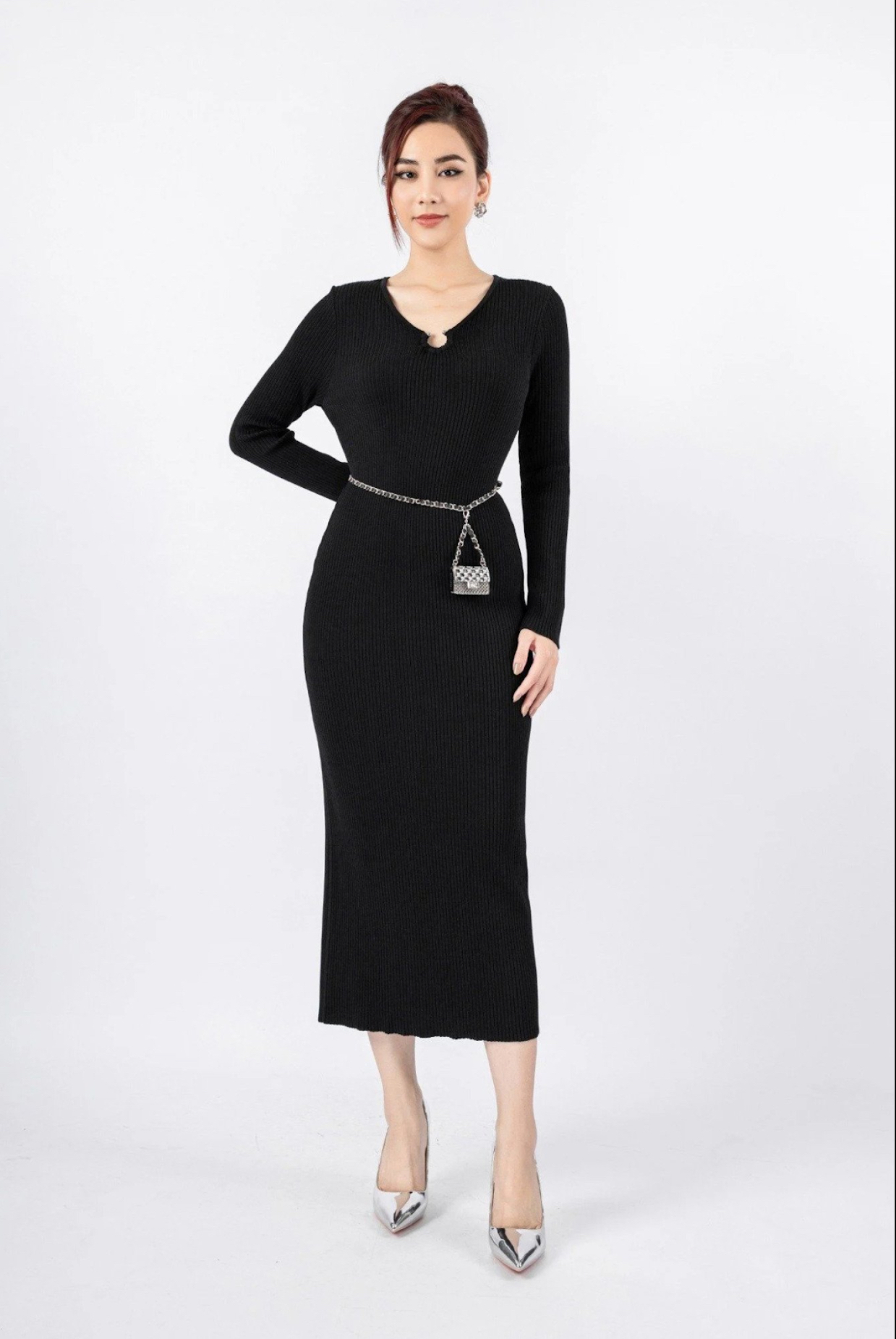 Đầm len dệt kim màu đen dáng dài qua gối mang đến sự ấm áp và mềm mại, ôm nhẹ theo từng đường cong nhưng vẫn giữ được sự thanh lịch. Khi kết hợp với thắt lưng dạng dây xích kim loại mảnh, đính kèm chiếc túi mini trang trí màu bạc, toàn bộ diện mạo lập tức bừng sáng.