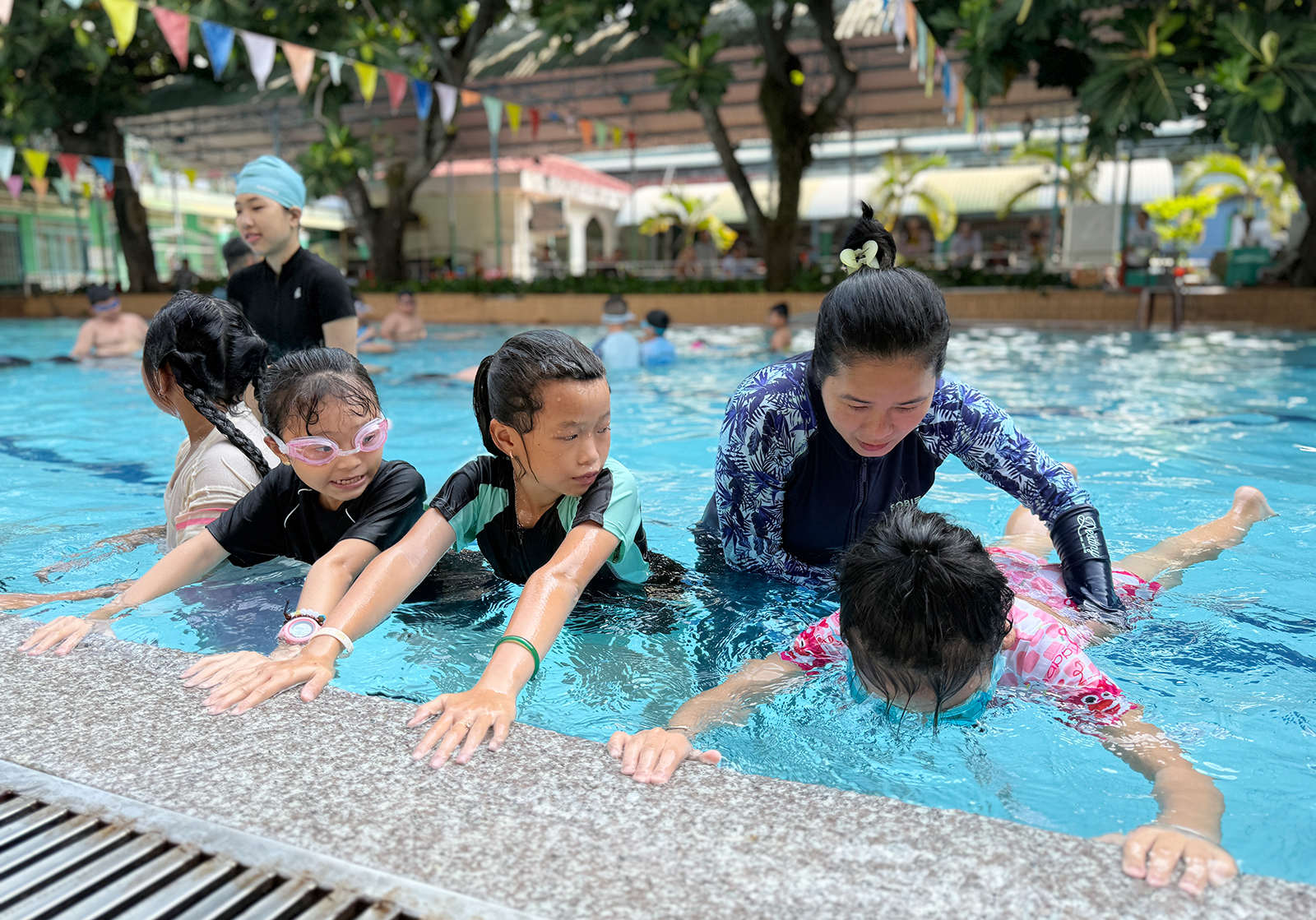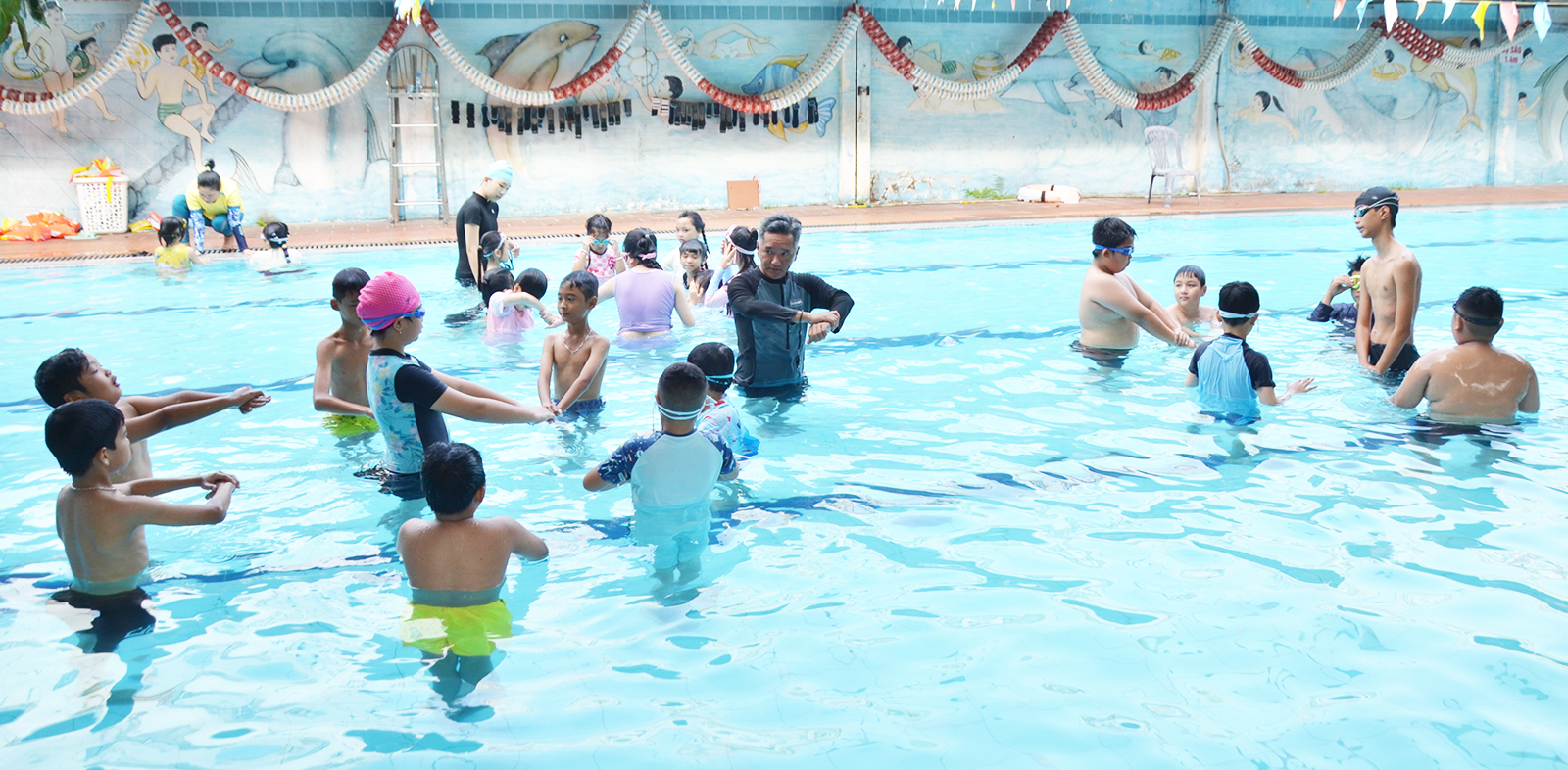 Học sinh, thiếu nhi được hướng dẫn các kỹ năng bơi cơ bản.