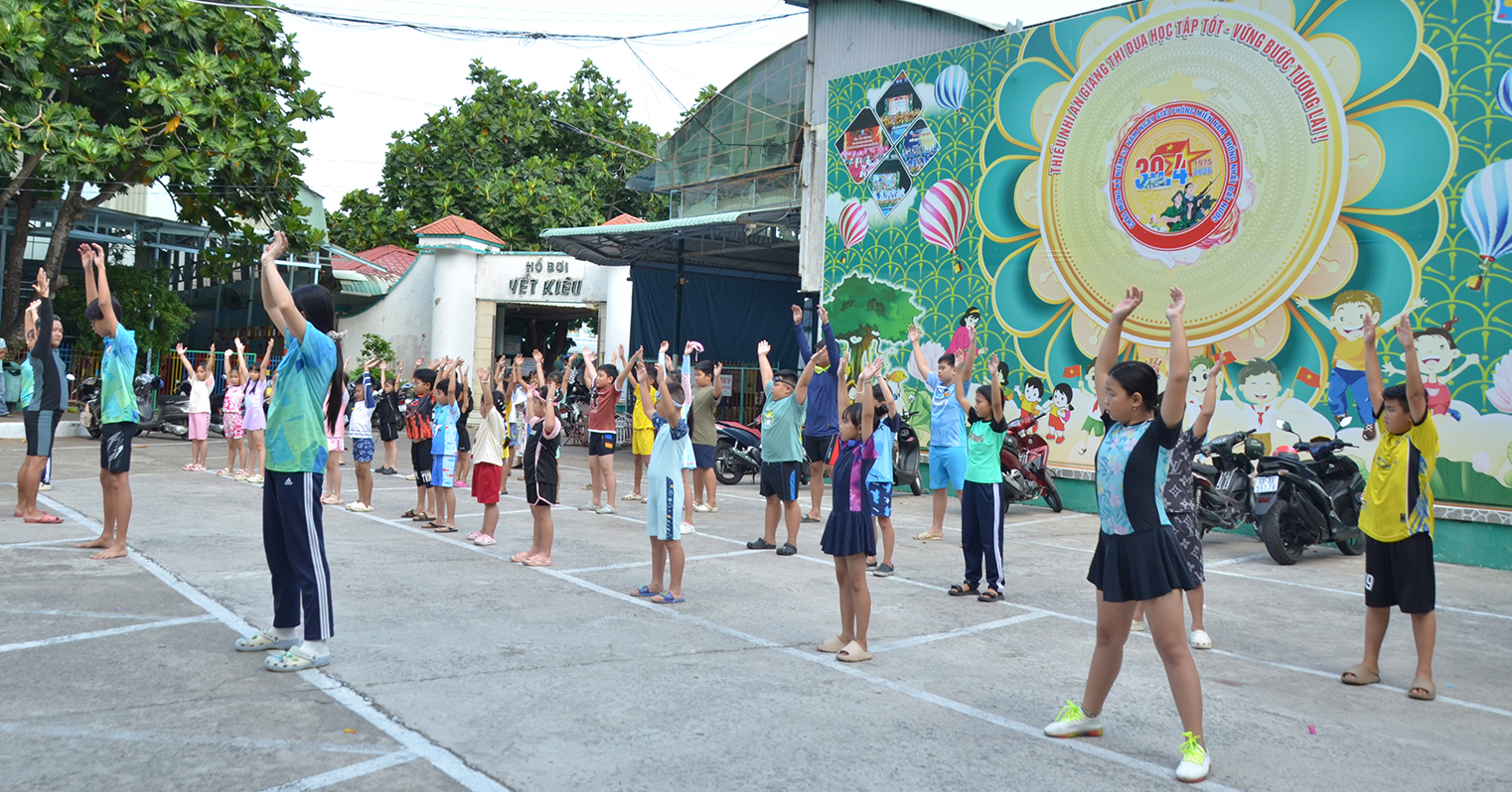 Học sinh, thiếu nhi khởi động trước khi xuống hồ bơi.