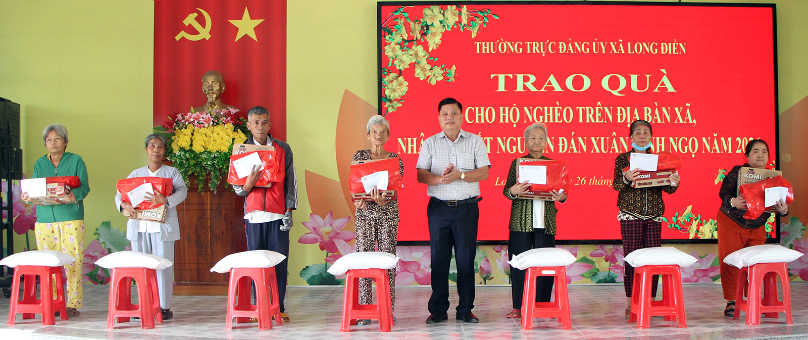 Thường trực Đảng ủy xã Long Điền trao quà Tết cho các hộ dân. Ảnh: HẠNH CHÂU