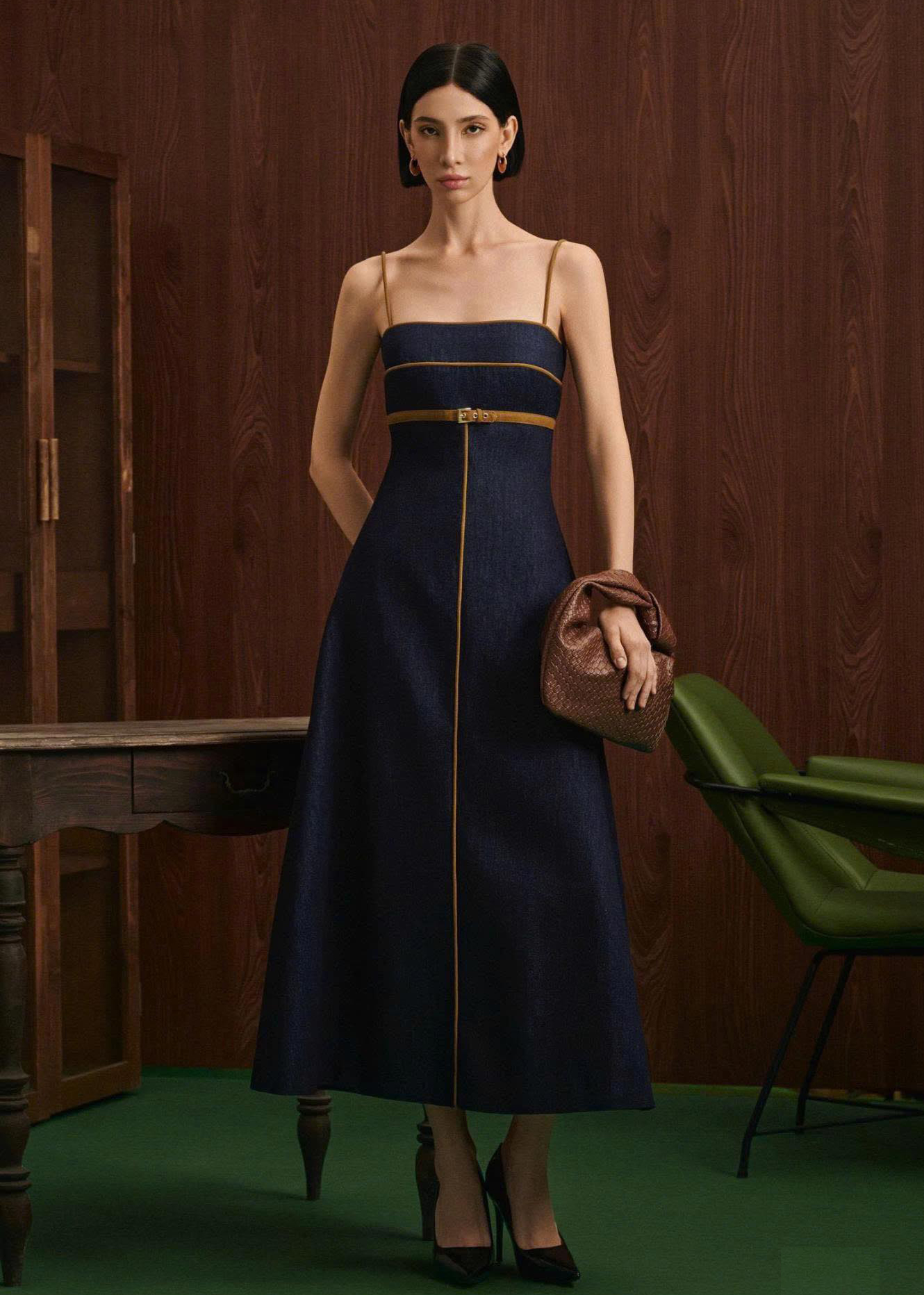 Các thiết kế denim mang đến cảm giác điềm tĩnh, sự dịu dàng hòa quyện trong cảm giác nữ tính đầy khí chất. Trang phục đầm cổ yếm, set áo crop top và chân váy dài... đã được loại bỏ nhiều chi tiết quen thuộc để chỉ giữ lại những đường nét quan trọng và cần thiết nhất. Chất liệu và hình khối hòa quyện, sắc xanh indigo của denim giao hòa cùng những đường viền màu caramel tạo nên điểm nhấn xuất sắc. ẢNH: ANH CLOTHES