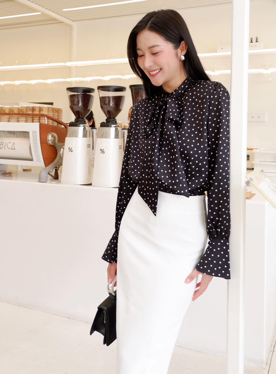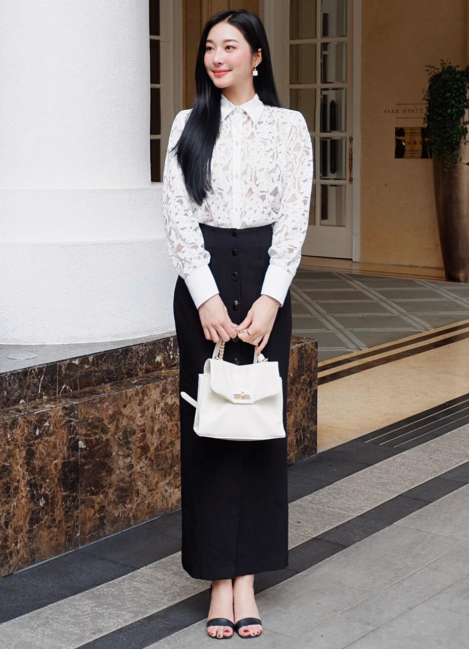 Sự kết hợp của bản phối trắng đen trên cặp đôi áo và chân váy dài luôn đem lại hiệu quả về mặt thẩm mỹ và công năng. Ngoài trang phục, đừng quên sử dụng giày, túi và phụ kiện bổ sung để bản phối thêm hoàn hảo. ẢNH: RUZA
