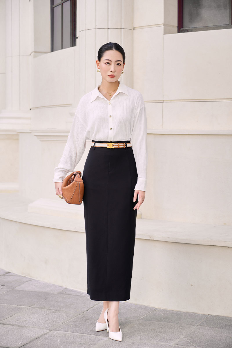 Thiết kế đường xẻ tà tạo hiệu ứng uyển chuyển khi di chuyển, vừa kín đáo vừa gợi cảm. Kết hợp áo sơ mi cổ nơ nhẹ và giày cao gót, giúp quý cô tỏa sáng nơi công sở hay các sự kiện quan trọng