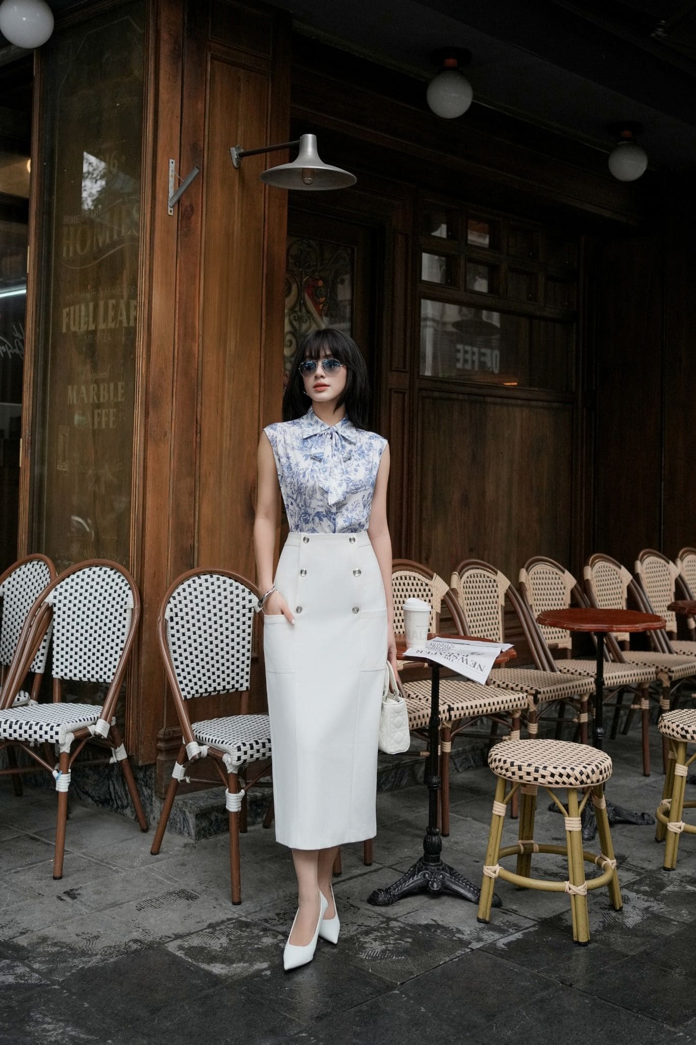 Chất liệu đứng dáng ôm trọn vóc dáng, đường cạp cao uốn lượn tôn vòng eo "đồng hồ cát". Độ dài qua gối nhẹ nhàng, kín đáo nhưng vẫn quyến rũ, phối với áo sơ mi kẻ sọc xanh bạc hà tạo phong cách công sở tự tin, đầy chuyên nghiệp.