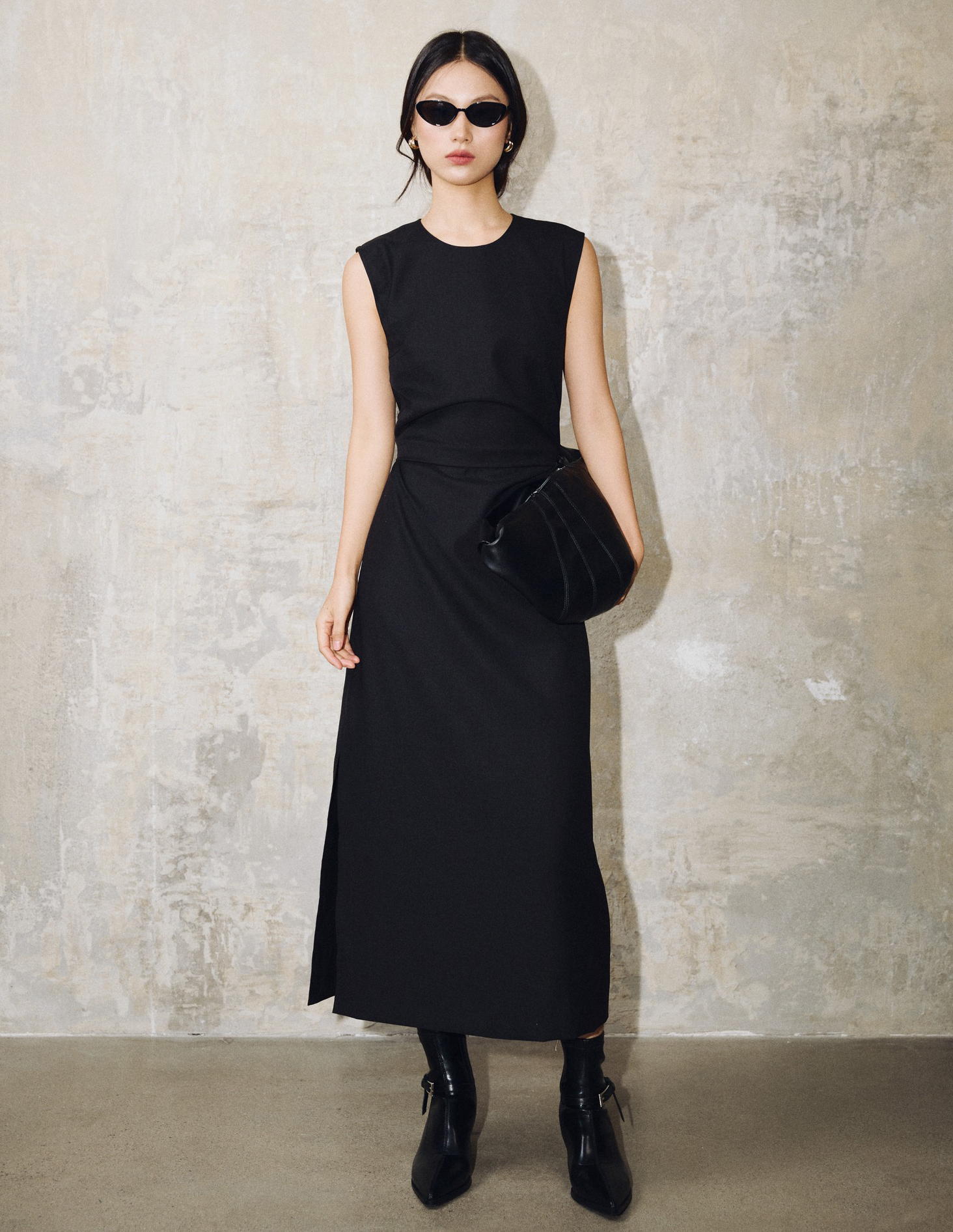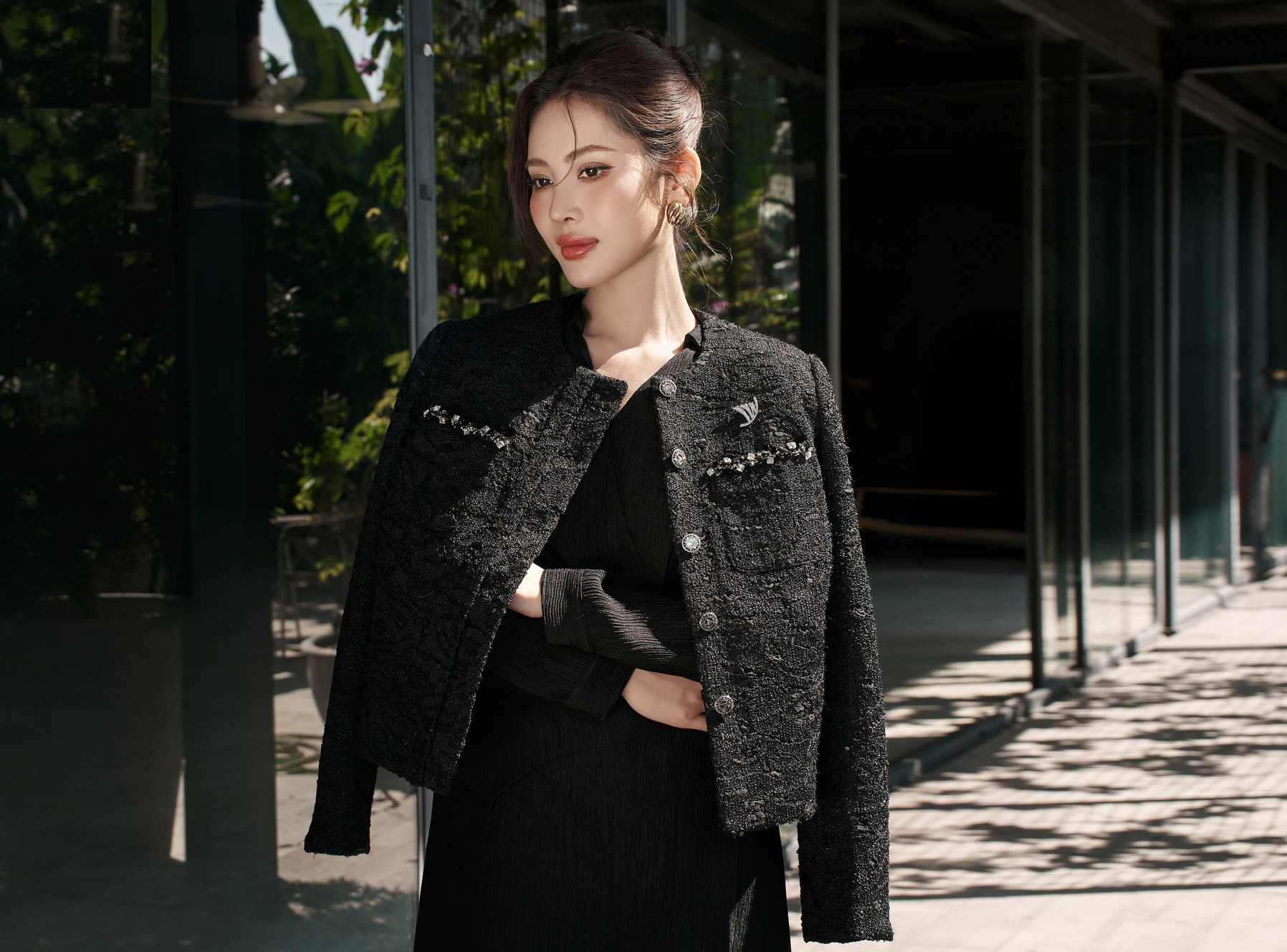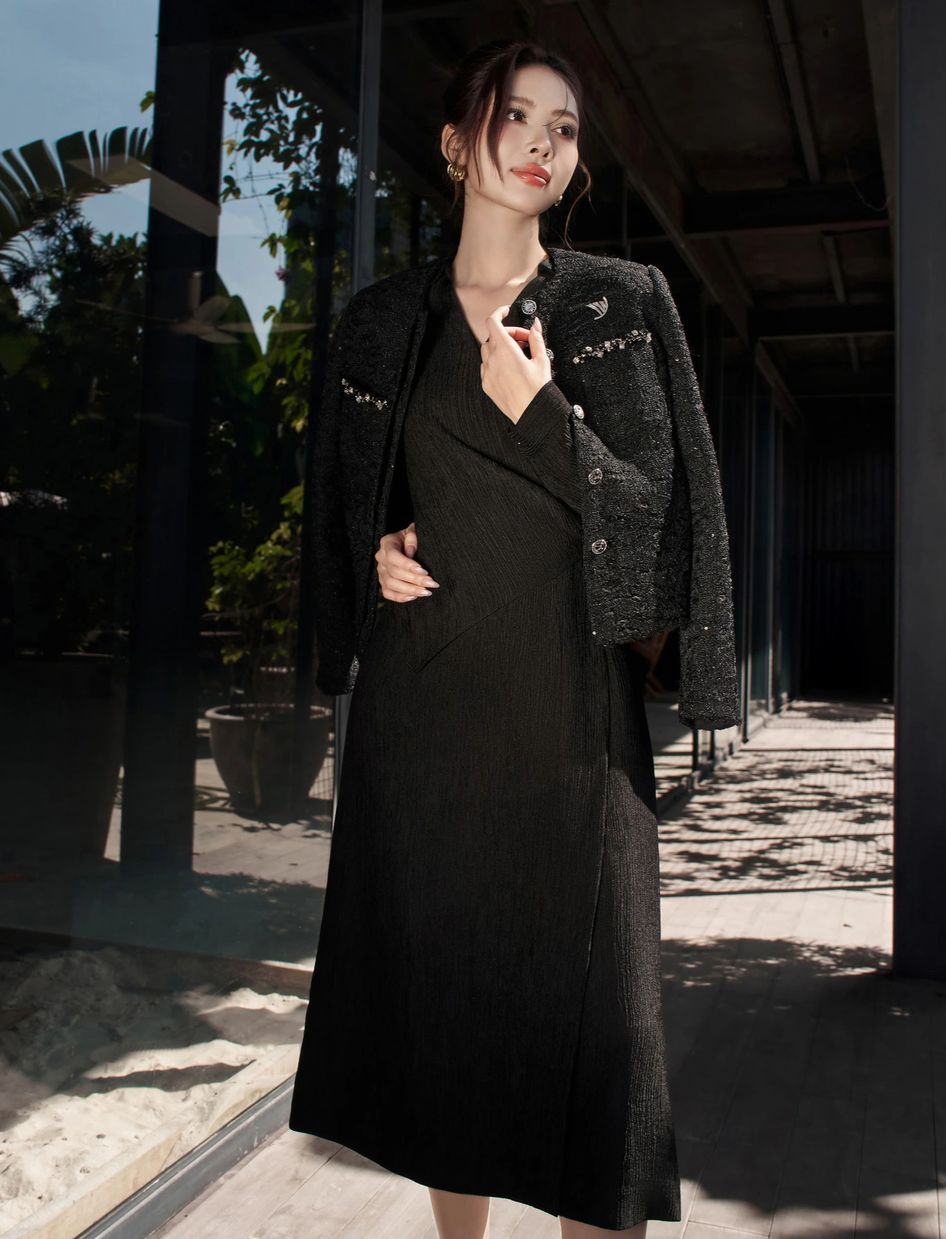Dành cho những khoảnh khắc quan trọng và những ngày đầu năm mới, quý cô chọn khoác lên mình bản phối tông đen ấn tượng với sự tổng hòa hoàn hảo, các lớp chất liệu knit và fuzzy yarn được xếp chồng để tạo nên sự kết hợp có cấu trúc, chiều sâu và giàu cảm xúc. ẢNH: DELICATE