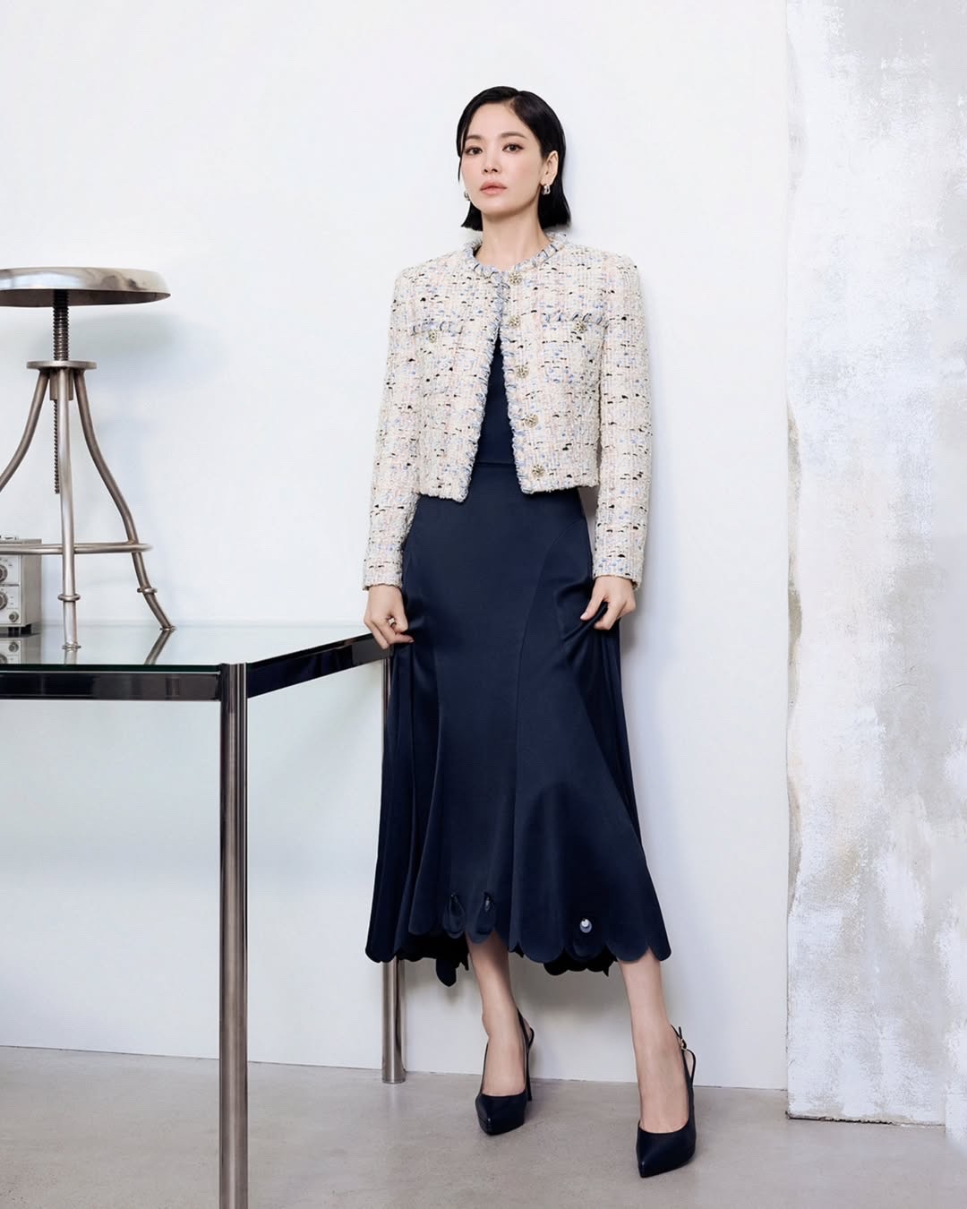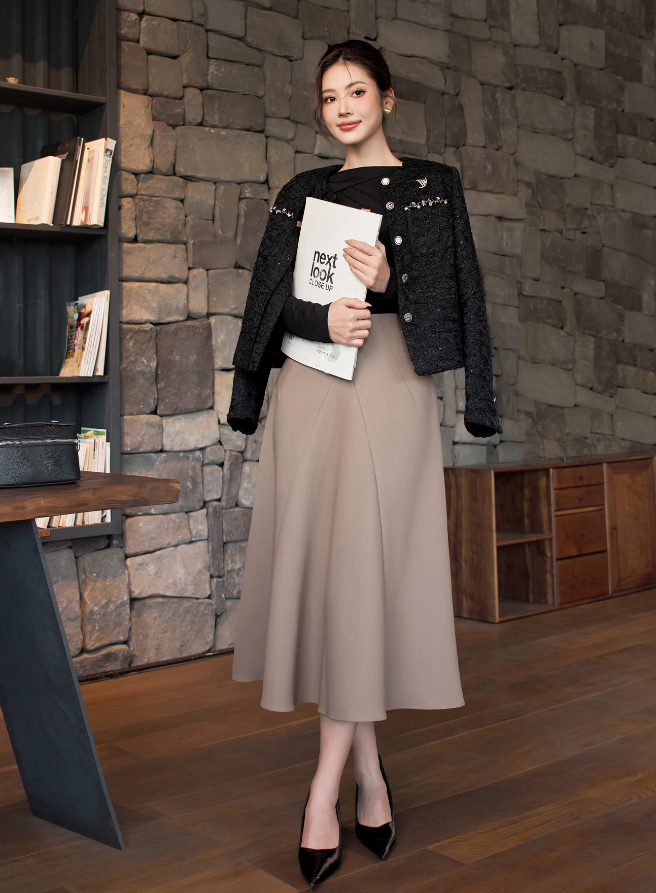 Áo tweed dáng ngắn có thể phối cùng chân váy midi và váy liền dáng dài cho các bản phối công sở. Áo khoác dạ lông cừu kết hợp cùng chân váy nhung in hoa dáng xòe và giày bốt da lộn cao gót cho các buổi gặp mặt dịp cuối năm. Thiết kế slip dress từ vải lụa satin phù hợp kết hợp cùng áo len dệt kim, áo choàng cape, áo khoác tweed...