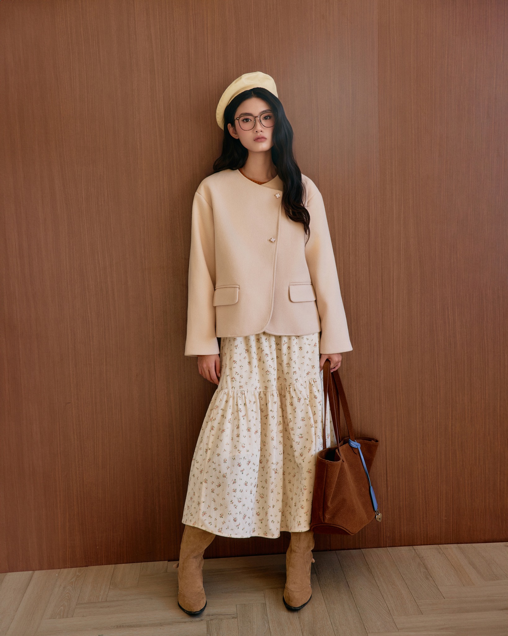 Phối áo dạ ép và chân váy nhung xếp tầng in hoa nhí cùng những phụ kiện da lộn như giày bốt, túi xách và mũ bê rê để nàng tỏa sáng hình ảnh quý cô sành điệu, trendy. ẢNH: MADELEN