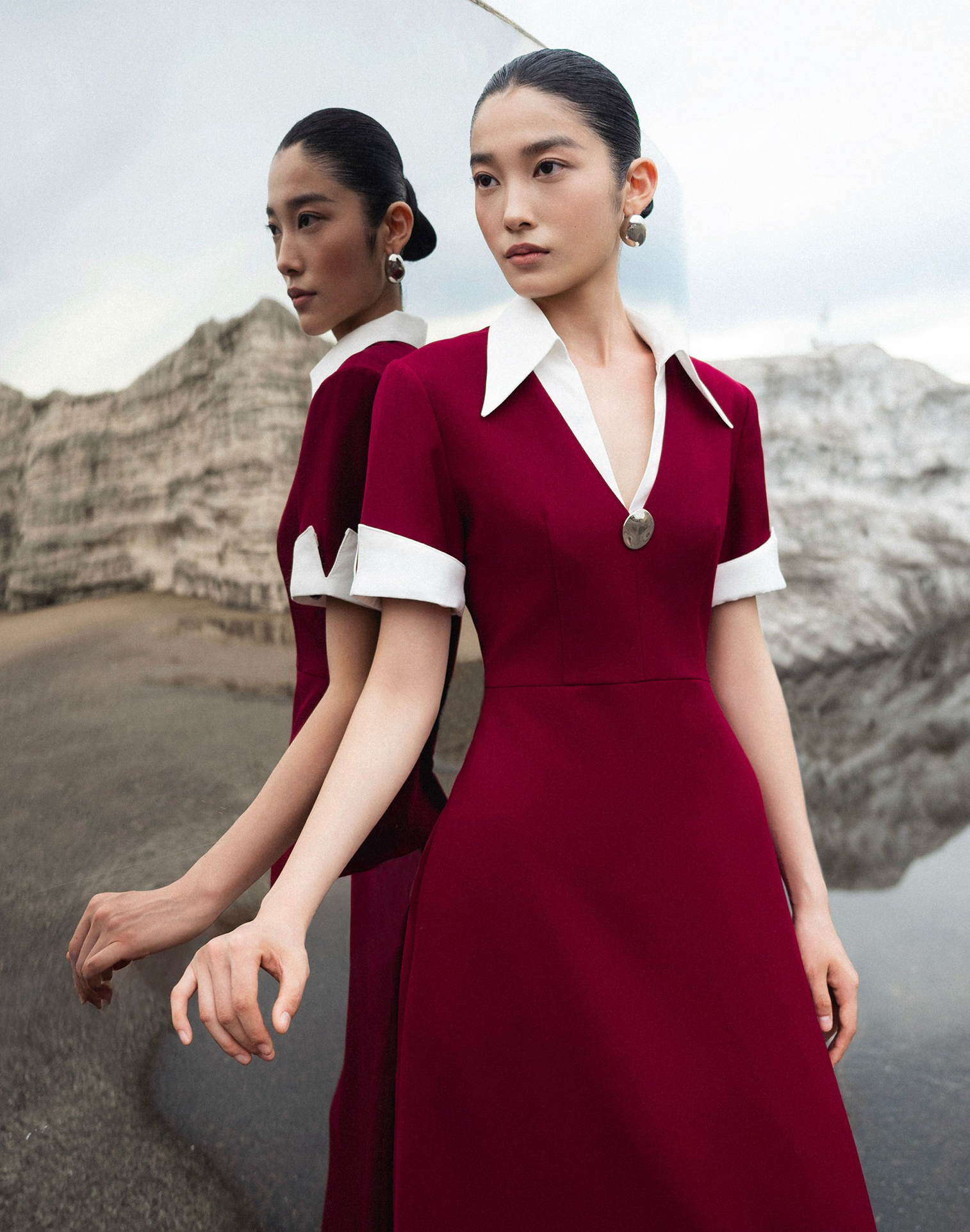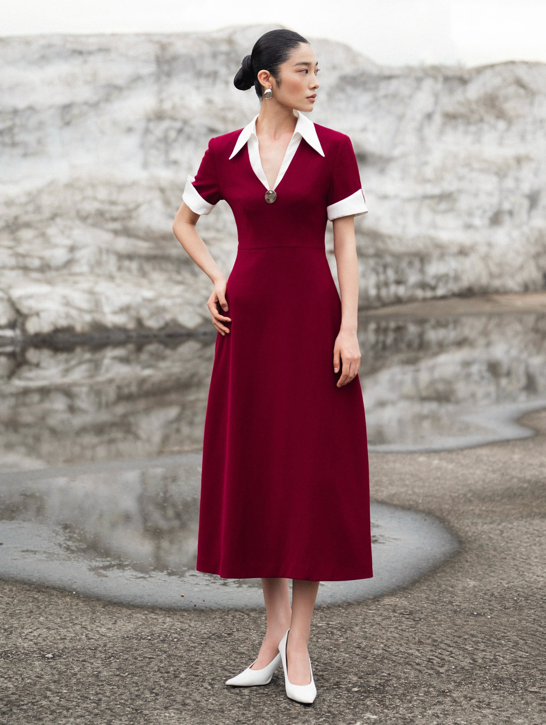 Đầm chữ A cổ điển được làm mới bằng sự kết hợp, nhấn nhá tinh tế của hai gam màu trắng và đỏ tía. Chi tiết cúc mạ sáng bóng là điểm nhấn tạo nên vẻ quyến rũ sành điệu cộng hưởng đồng điệu cùng trang sức đeo tai. ẢNH: HAGOO