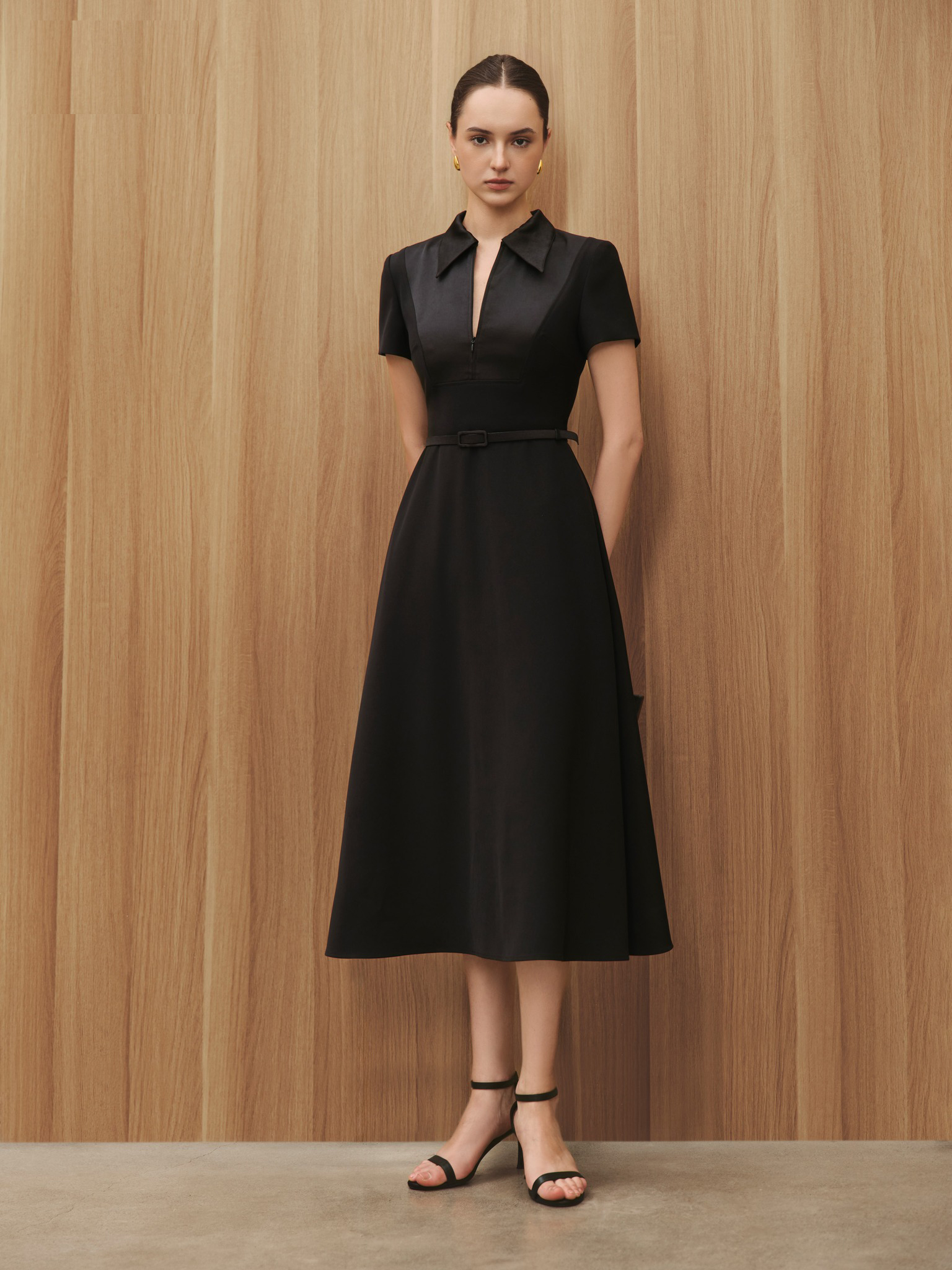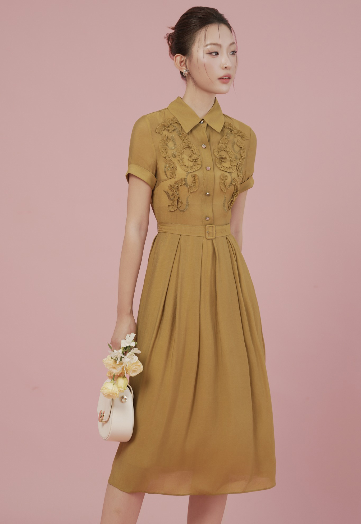 Váy sơ mi vải tơ có điểm nhấn là họa tiết được may chồng trên nền vải cùng tông màu. Phom dáng tinh giản, hiện đại với phần tay ngắn, cổ áo sơ mi kèm đai eo mang đến hình ảnh chỉn chu và chuyên nghiệp. ẢNH: SIXDO