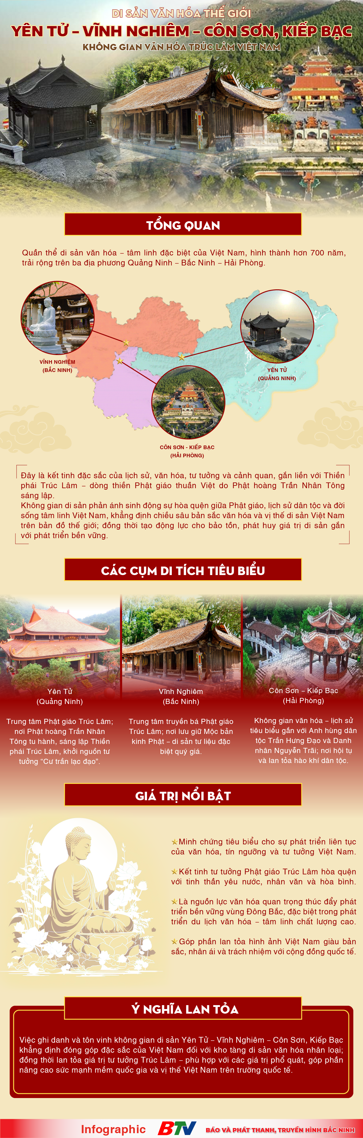 Quần thể di tích và danh thắng Yên Tử - Vĩnh Nghiêm - Côn Sơn, Kiếp Bạc thuộc 3 tỉnh Quảng Ninh - Bắc Ninh - Hải Phòng là di sản đặc biệt, kết tinh hài hòa giữa lịch sử, văn hóa, tư tưởng, cảnh quan, gắn liền với sự hình thành và lan tỏa của Thiền phái Trúc Lâm - dòng thiền thuần Việt. Quần thể di tích được ghi danh Di sản Văn hóa Thế giới khẳng định giá trị nổi bật toàn cầu, tôn vinh chiều sâu bản sắc và sức sống bền vững của văn hóa Việt Nam.