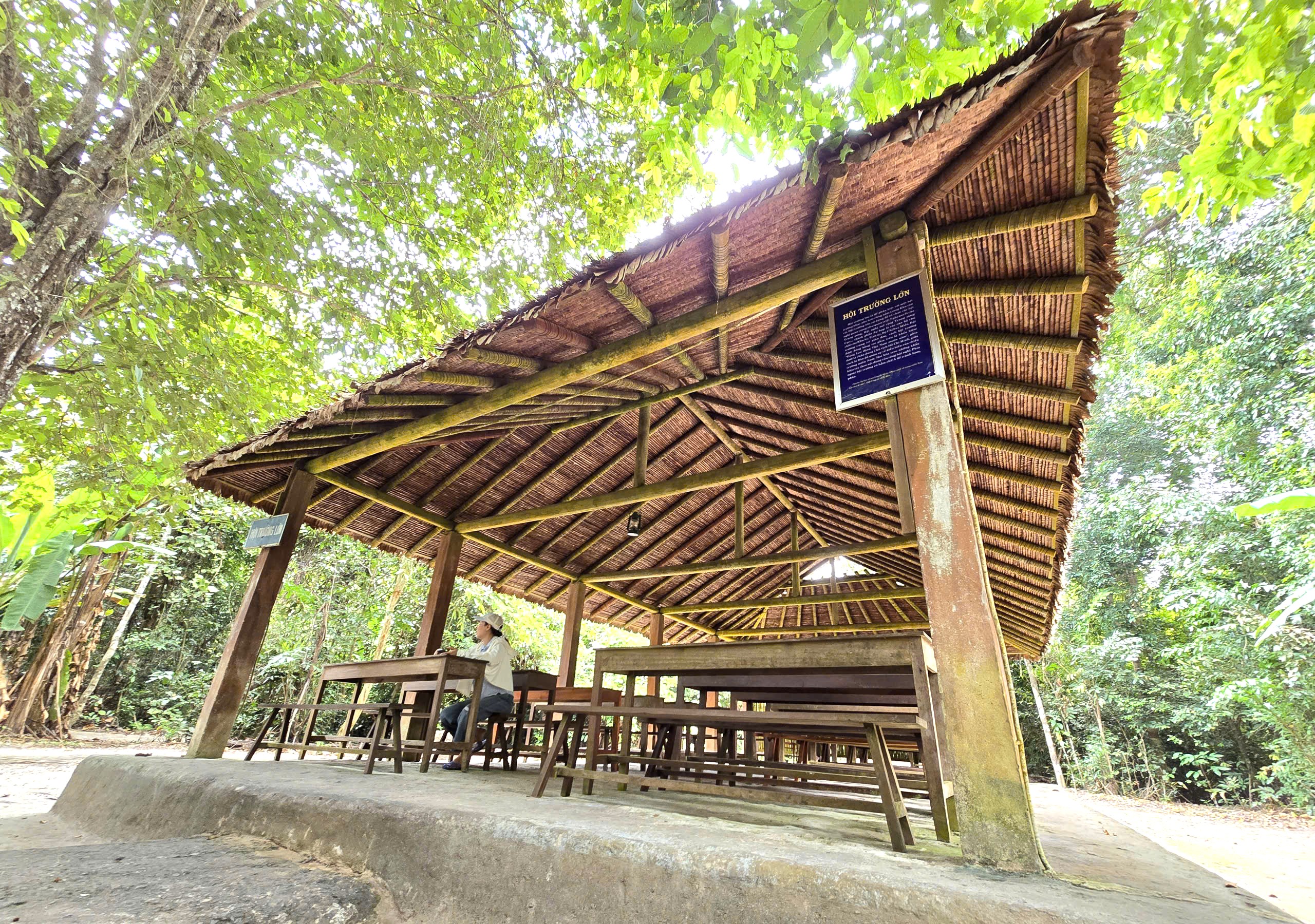 Hội trường lớn dưới tán rừng Rùm Đuôn, nơi lãnh đạo Trung ương Cục miền Nam họp bàn và ra các quyết định quan trọng. ẢNH: BẮC BÌNH
