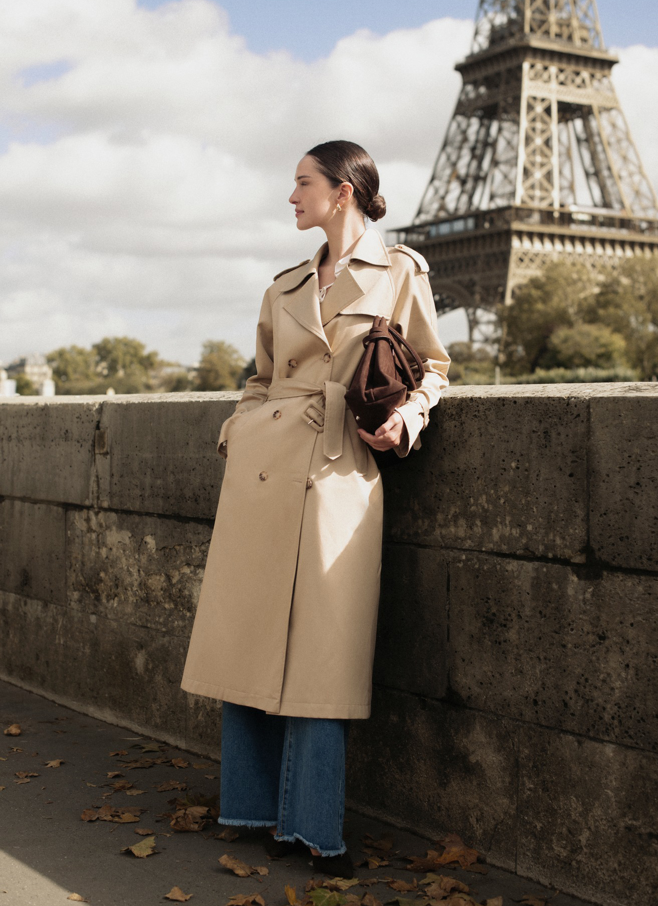Chất liệu vải dù hay vải kaki đứng đầu về khả năng cản gió, chống thấm nước và giữ nhiệt tốt nên thường được diện khi nàng cần di chuyển lâu ngoài trời. Áo măng tô phối quần jeans xanh, giày cao gót tạo nên dáng vẻ trang nhã và năng động. ẢNH: MONO TALK