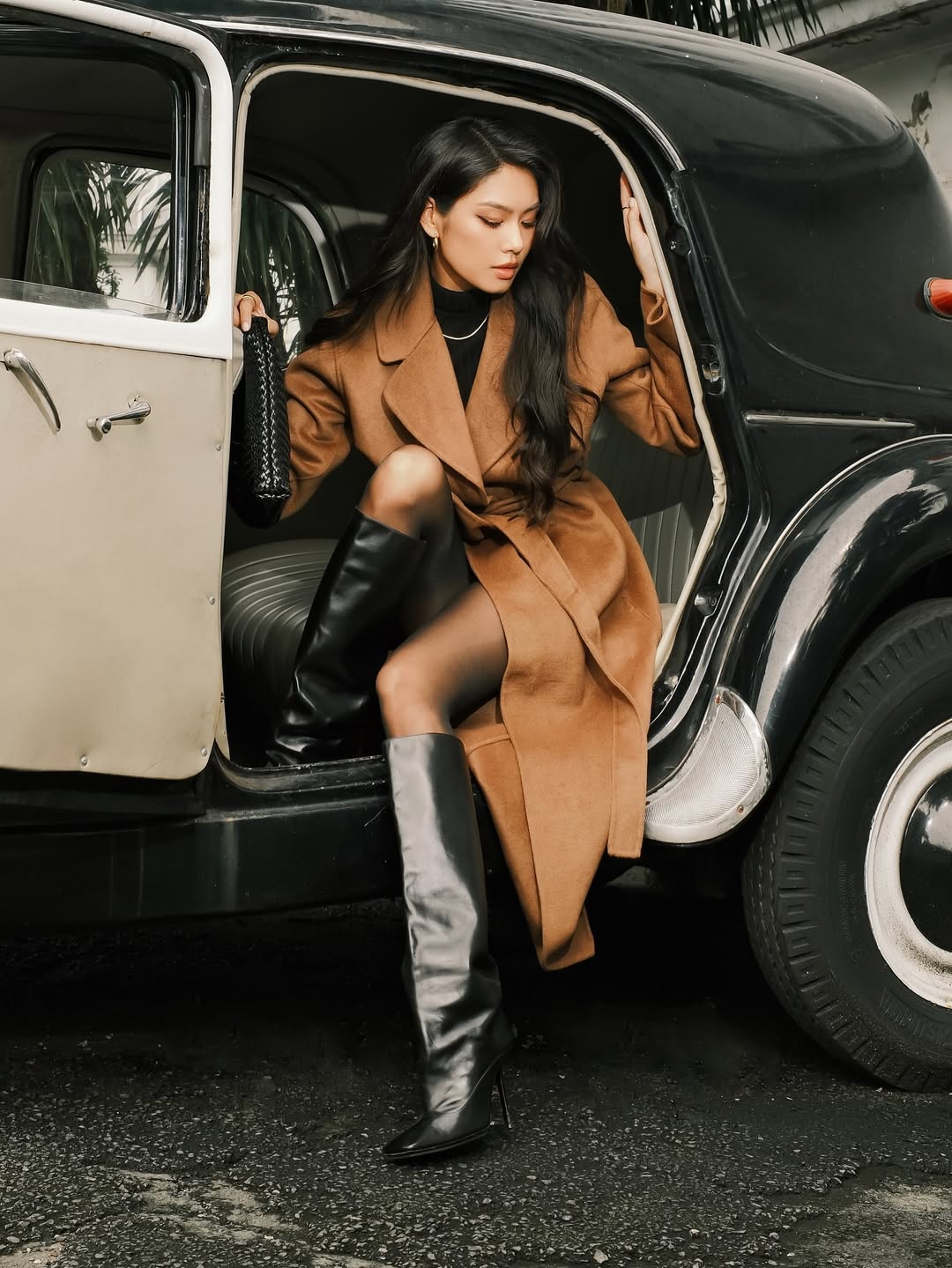 Áo khoác dáng dài (áo măng tô - trench coat) hoàn hảo cho mùa đông lạnh giá. Nữ fashionista kết hợp áo khoác màu nâu caramel cùng áo cổ lọ đen, giày bốt da cao gót để tạo nên hình ảnh tương phản, phá cách đầy khí chất. ẢNH: @THAONHILE