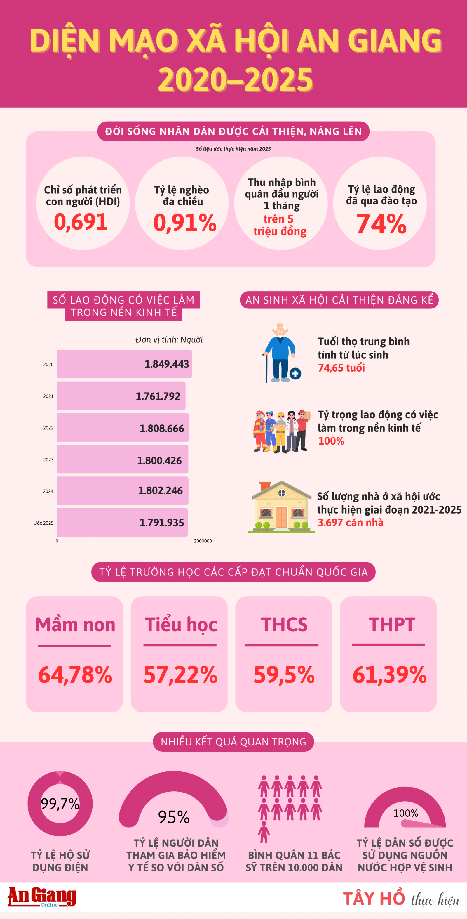 - Trong giai đoạn 2020–2025, diện mạo xã hội An Giang có nhiều đổi thay rõ nét: Dân số ổn định, tỷ lệ đô thị hóa tăng nhanh; cơ cấu lao động chuyển dịch theo hướng giảm dần nông nghiệp, tăng mạnh dịch vụ; tuổi thọ trung bình và chỉ số phát triển con người (HDI) đều được cải thiện. Các lĩnh vực giáo dục, y tế, phúc lợi xã hội cũng ghi dấu những bước tiến vững chắc, với tỷ lệ trường đạt chuẩn quốc gia tăng đều, bảo hiểm y tế bao phủ rộng, thu nhập bình quân đầu người nâng cao và tỷ lệ nghèo đa chiều giảm còn 0,91%. Những kết quả này phản ánh nỗ lực bền bỉ của cả hệ thống chính trị và người dân trong việc nâng cao chất lượng cuộc sống.