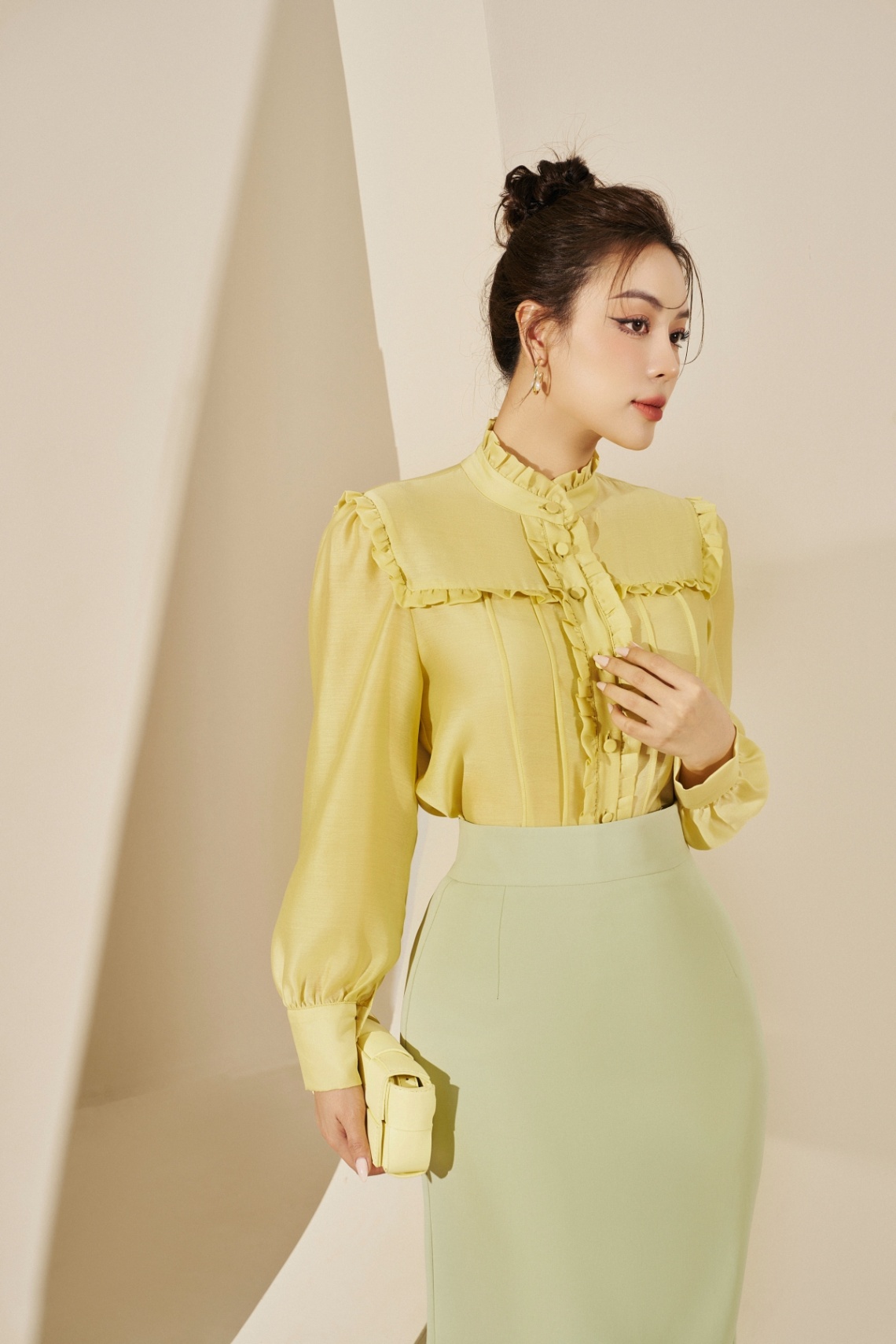 Chiếc áo cổ bèo nhún chạy dọc phần thân trên tạo điểm nhấn tinh tế. Tay áo bồng nhẹ và cổ tay thu nhỏ giúp tổng thể thanh thoát. Khi phối cùng chân váy bút chì màu xanh mint nhạt, nàng có ngay bản phối công sở dịu mắt, thời thượng mà vẫn đảm bảo phong thái trang nhã.