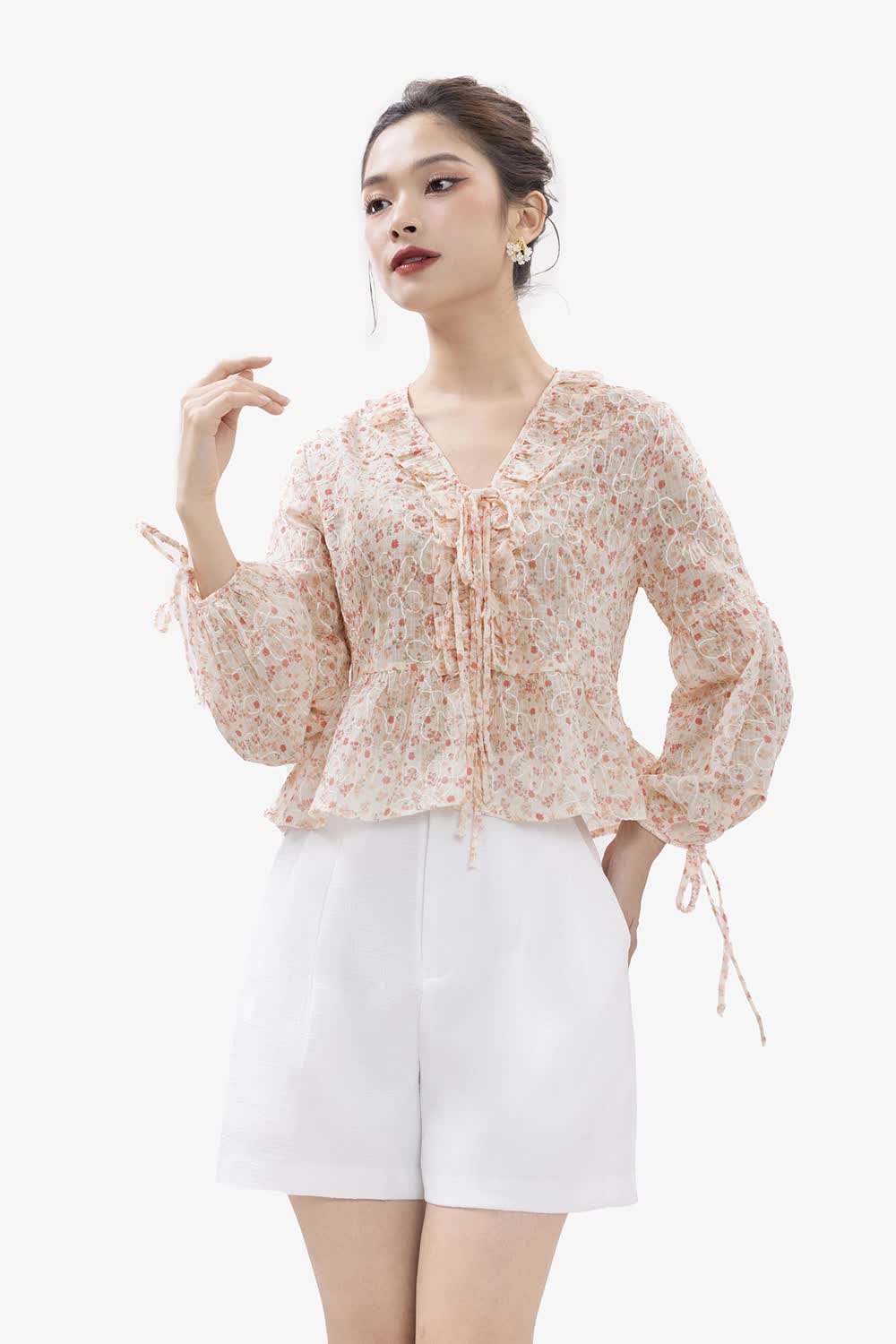 Thân áo nhún thun nhẹ tạo độ ôm mềm mại, tay dài phồng nhẹ kèm dây buộc ở cổ tay tăng phần nữ tính. Khi kết hợp cùng quần shorts trắng cạp cao, set đồ trở nên trẻ trung nhưng không kém phần tinh tế. Đây là lựa chọn hoàn hảo cho ngày cuối tuần hoặc những buổi đi chơi nhẹ nhàng.
