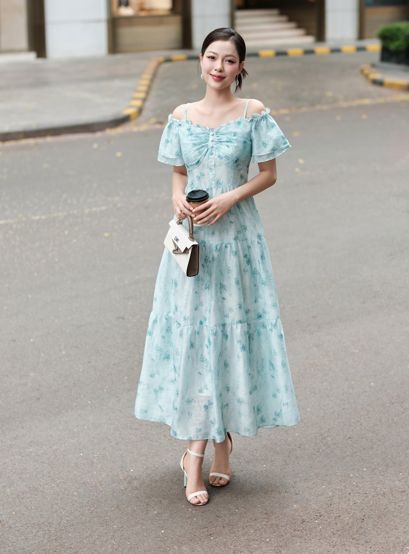 Mẫu váy nổi bật với gam màu bắt mắt, phom dáng yêu kiều, tùng xòe nhẹ nhàng tôn lên đường nét nữ tính. Sắc xanh tươi mát, họa tiết hoa tinh tế giúp nâng tầm nhan sắc. ẢNH: BEM DESIGN