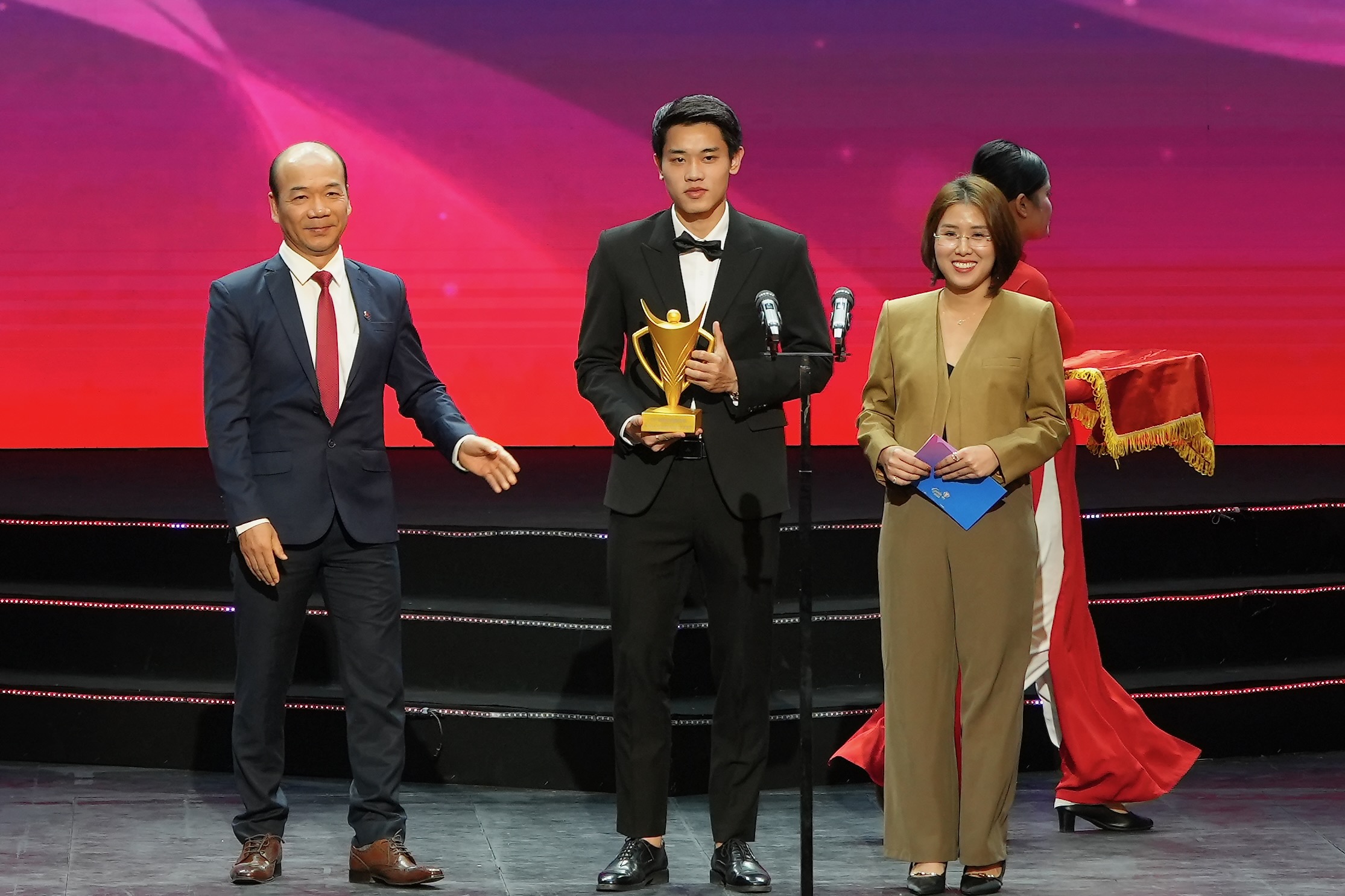 Nhân vật được quan tâm nhất sự kiện là cầu thủ Nguyễn Đình Bắc được vinh danh ở hạng mục Vận động viên trẻ của năm. Anh vừa từ Nghệ An ra Hà Nội nên khá mệt sau hàng loạt chương trình giao lưu với người hâm mộ sau VCK U23 châu Á 2026.