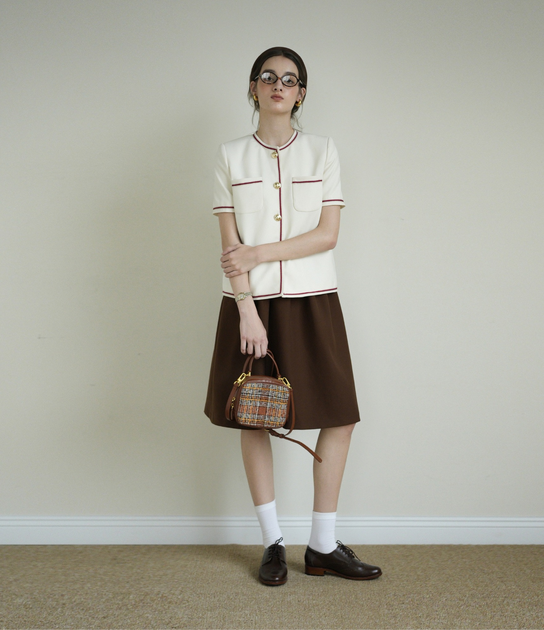 Bản phối chuẩn phong cách vintage với áo cardigan, kết hợp chân váy lửng tạo vẻ thanh lịch và trầm ấm. Phụ kiện tông nâu như túi dạ tweed và giày Oxford giúp tổng thể thêm phần cổ điển, chỉn chu nhưng vẫn thời thượng. ẢNH: TIT.ELEGANT