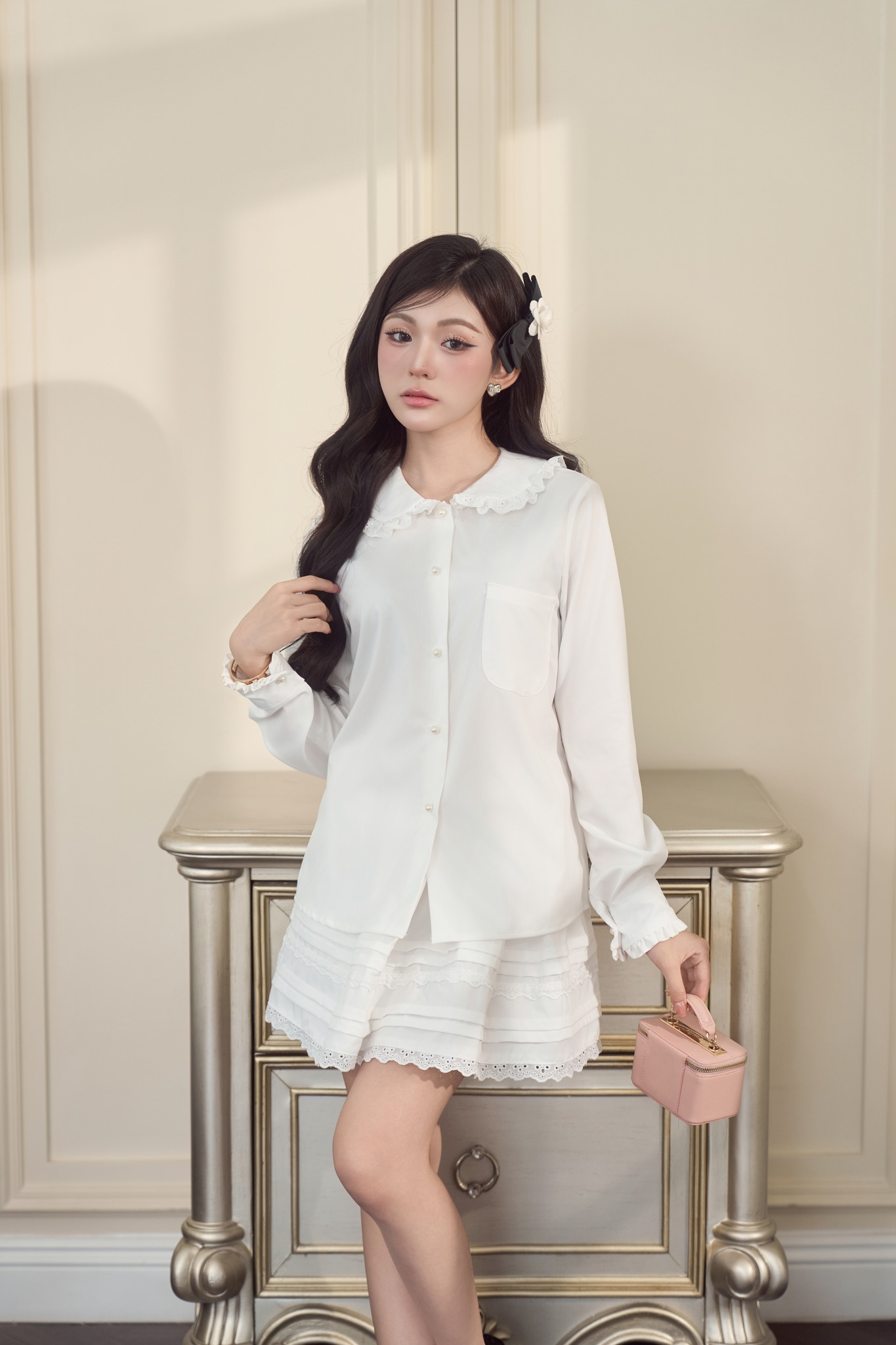 Chiếc áo sơ mi trắng dáng dài với cổ bèo ren mang lại vẻ trong trẻo và dịu dàng đặc trưng. Phần tay áo bo nhẹ cùng hàng khuy ngọc giúp tổng thể thêm phần nữ tính. Khi phối cùng chân váy trắng xếp tầng, tổng thể trở nên mềm mại, thanh lịch. ẢNH: D.T.M BY THAOMY