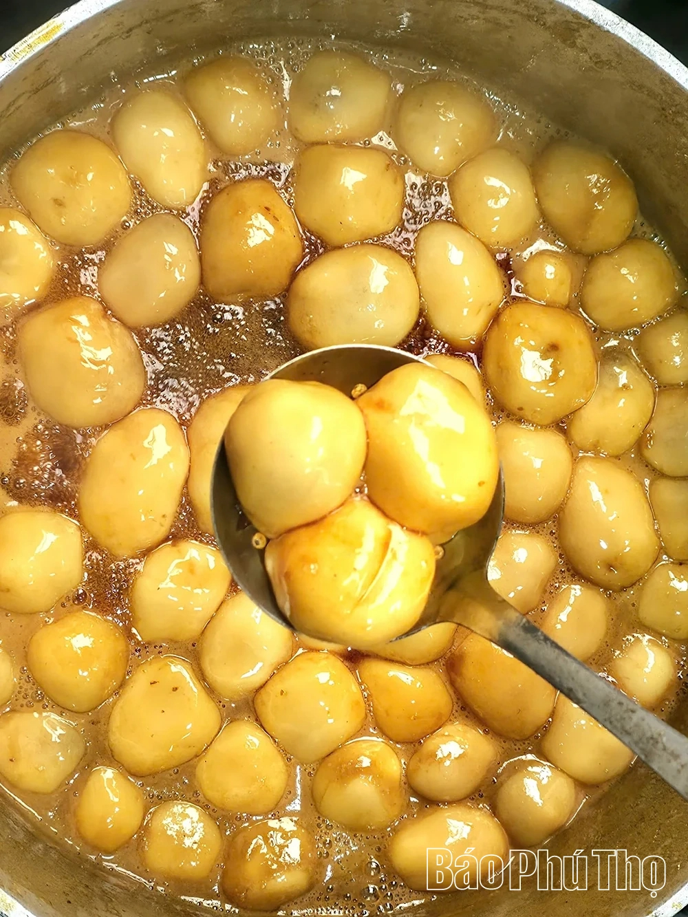Điểm làm nên “cái hồn” của món bánh chính là mật mía “nước hai” – loại mật tinh lọc, thơm và sánh. Khác với cách luộc bánh trôi bằng nước, bánh Dùng được thả trực tiếp vào nồi mật mía đang sôi. Đây là công đoạn đòi hỏi tay nghề và kinh nghiệm của người làm bánh.