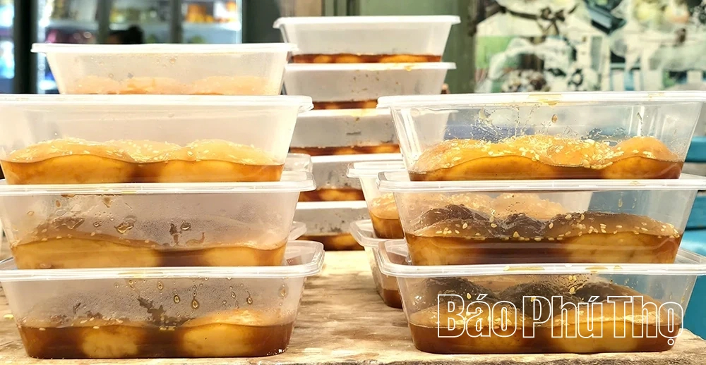 Chị Lê Thị Tĩnh, thôn Bắc Cường, xã Thổ Tang vào dịp tiết Thanh minh làm bánh Dùng mật mía bán cho người dân và du khách.