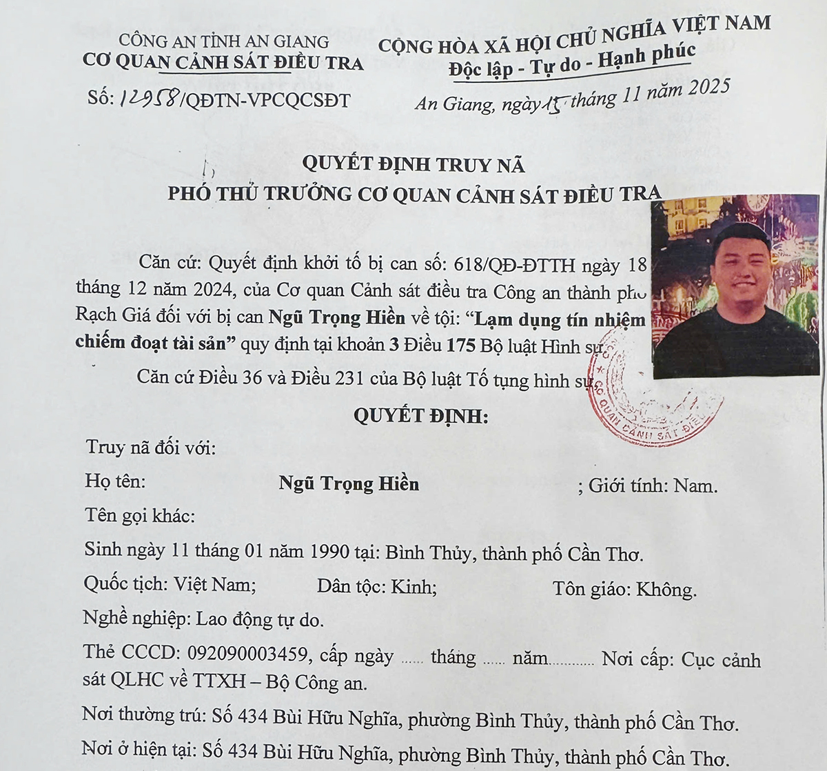 Sau khi cơ quan công an ra quyết định khởi tố vụ án, khởi tố bị can và ra lệnh bắt bị can để tạm giam đối với Hiền, nhưng đối tượng đã bỏ trốn khỏi địa phương. Ngày 15/11, Cơ quan Cảnh sát điều tra Công an tỉnh An Giang ra quyết định truy nã đối với Hiền về tội “Lạm dụng tín nhiệm chiếm đoạt tài sản”.