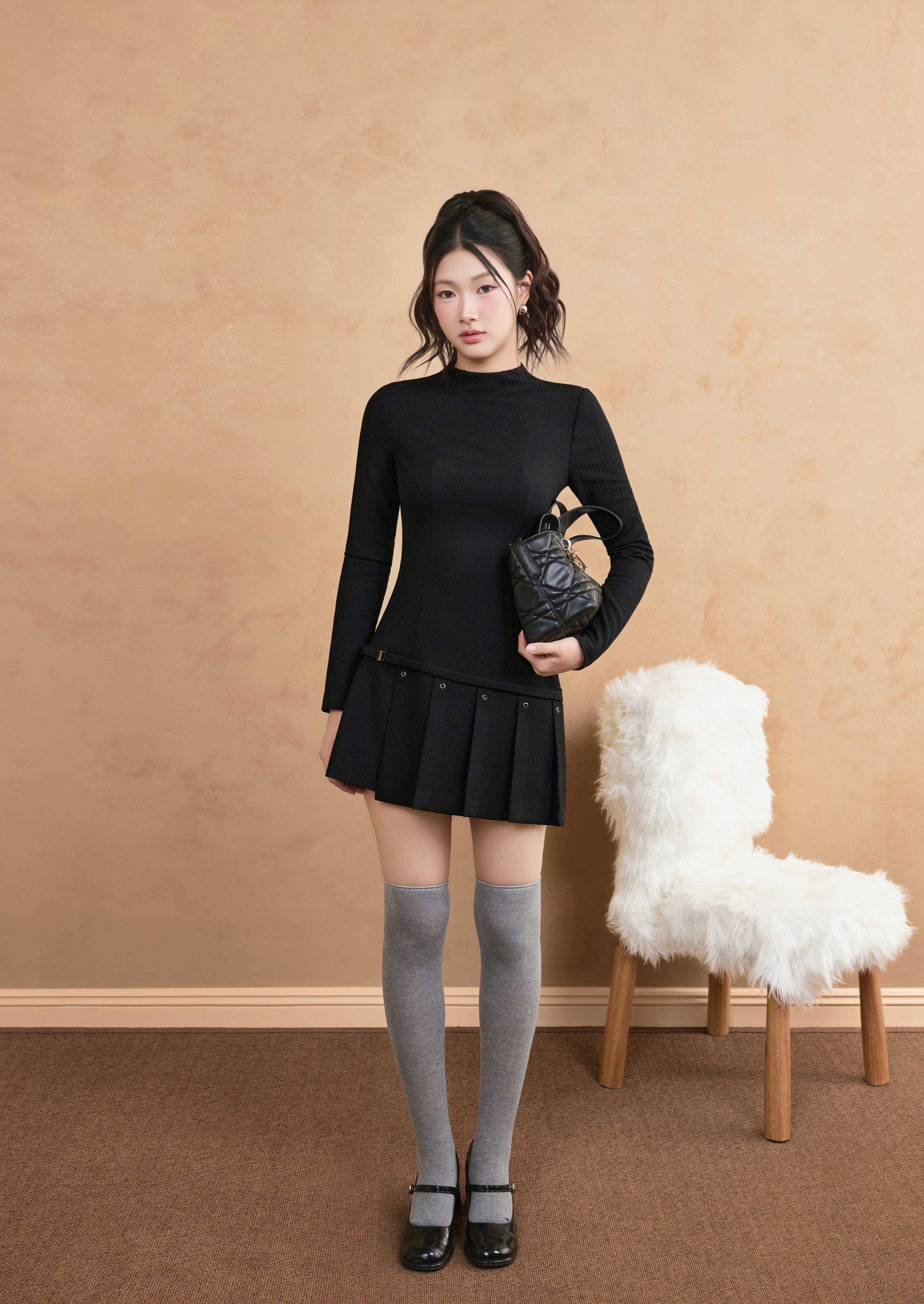 Sắc đen được chọn làm nền chủ đạo với chiếc đầm tay dài ôm dáng, phần thân trên gọn gàng giúp định hình vóc dáng rõ nét. Chân váy xếp ly ngắn, kết hợp cùng đai khuy kim loại đặt khéo léo ở vòng eo. Điểm cộng tinh tế nằm ở đôi tất cao cổ màu xám, chi tiết nhỏ nhưng mang lại hiệu ứng kéo dài đôi chân. ẢNH: JM DRESS DESIGN