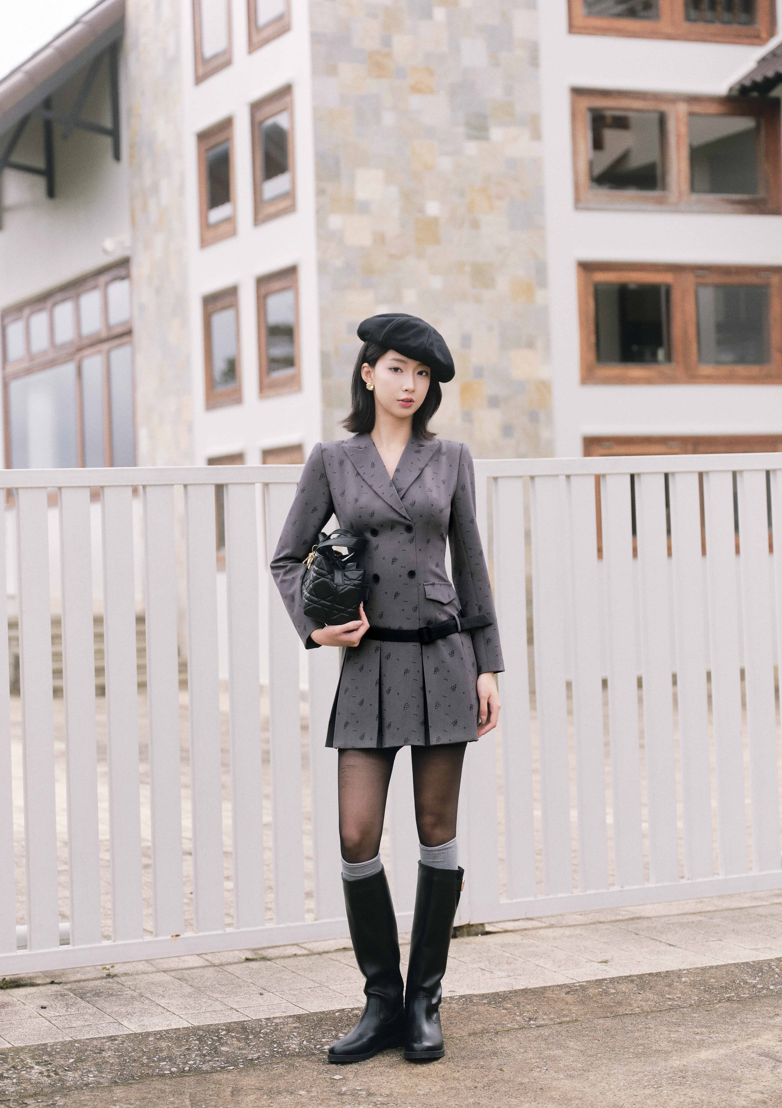 Áo blazer màu xám trở thành tâm điểm với phom dáng gọn gàng, đi cùng chân váy xếp ly tone sur tone hài hòa. Các phụ kiện tông đen như mũ nồi, thắt lưng và túi xách được lựa chọn có chủ đích, tạo nên sự đối xứng về màu sắc và giúp tổng thể rõ nét hơn. Đôi giày da đen cao cổ kết hợp cùng tất xám lộ nhẹ là “nốt nhấn” hoàn hảo, mang đến hình ảnh một cô gái thành thị hiện đại và hợp xu hướng. ẢNH: JM DRESS DESIGN