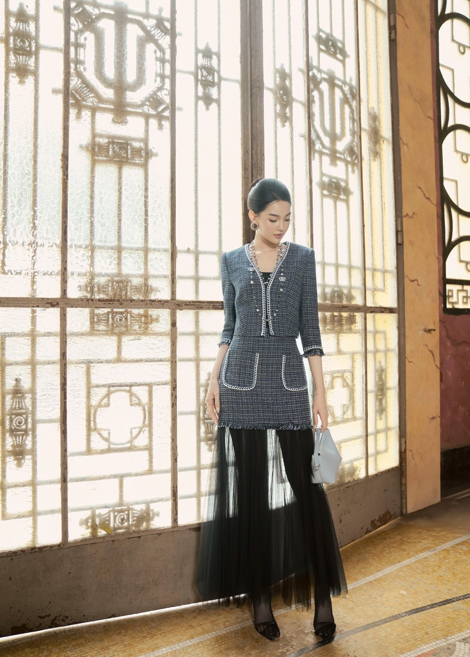 Sự sang trọng của đen và xám được thể hiện rõ nét trong thiết kế chia mảng đầy chủ ý. Phần thân trên là bộ set dạ màu xám, chân váy đen dáng dài kết hợp giữa vải voan và tweed tạo sự độc đáo ở phần dưới lại mang đến chiều sâu thị giác, tạo sự tương phản nhẹ nhàng nhưng đủ sức gây ấn tượng. ẢNH: ELISE