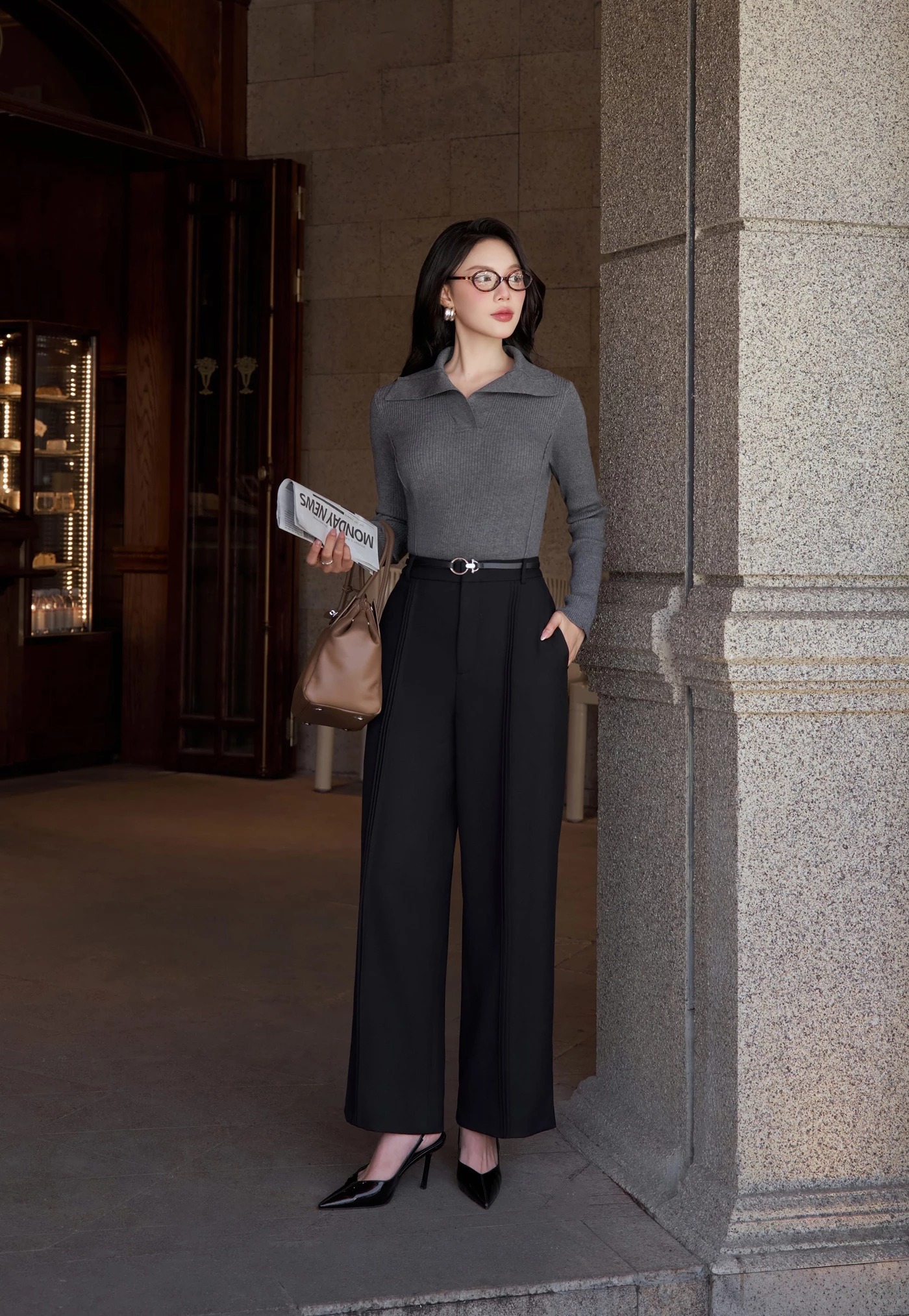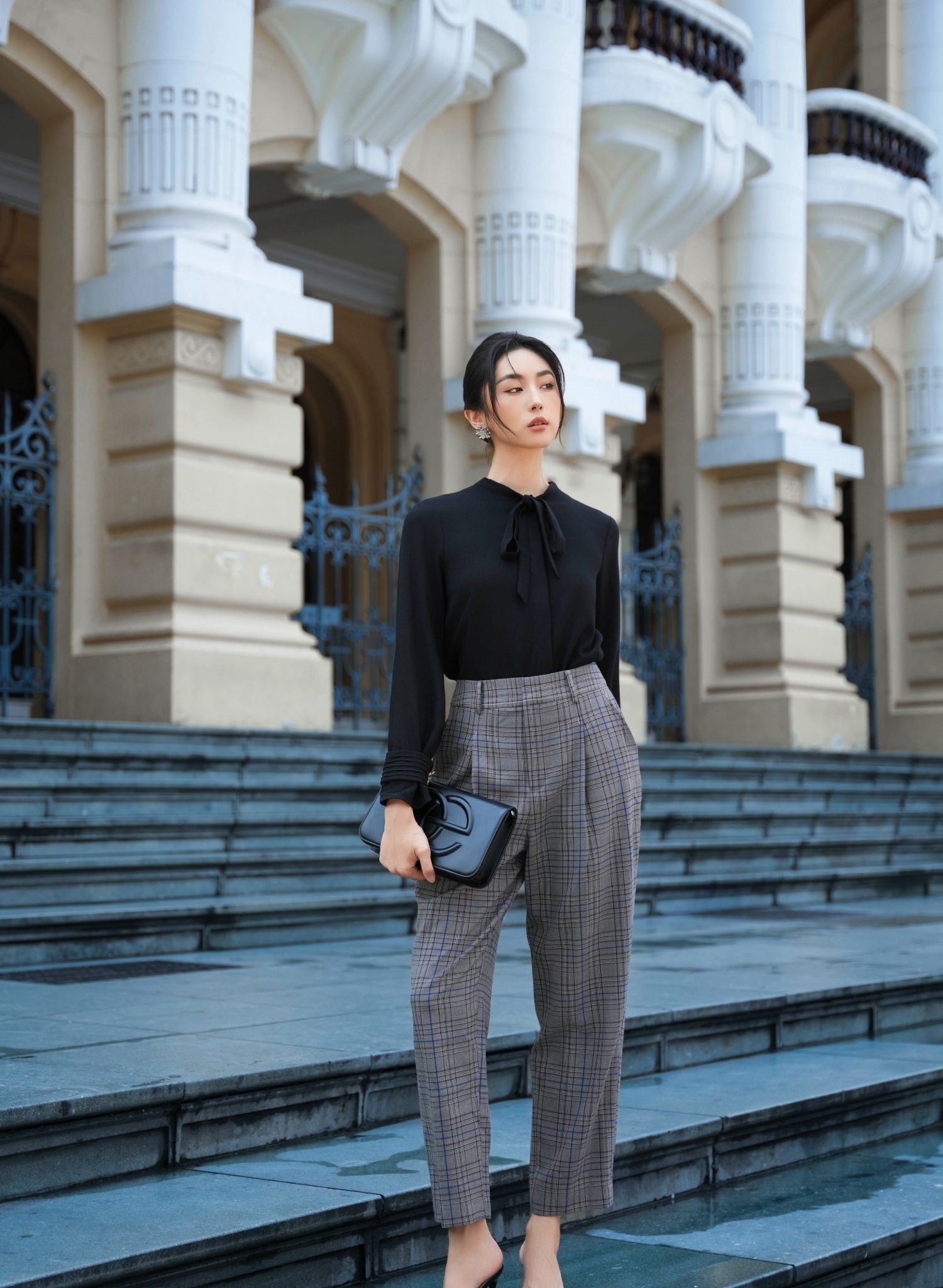 Sự giao thoa hoàn hảo giữa nét nữ tính của áo blouse đen thắt nơ điệu đà và vẻ hiện đại từ chiếc quần tây xám họa tiết kẻ. Thiết kế cạp cao cùng chi tiết xếp ly tinh tế không chỉ giúp tôn dáng người mặc mà còn mang lại phong thái tự tin. Tông đen quyền lực và sắc xám trung tính khi kết hợp tạo nên một tổng thể tối giản nhưng vẫn toát lên chiều sâu thẩm mỹ. ẢNH: ELISE