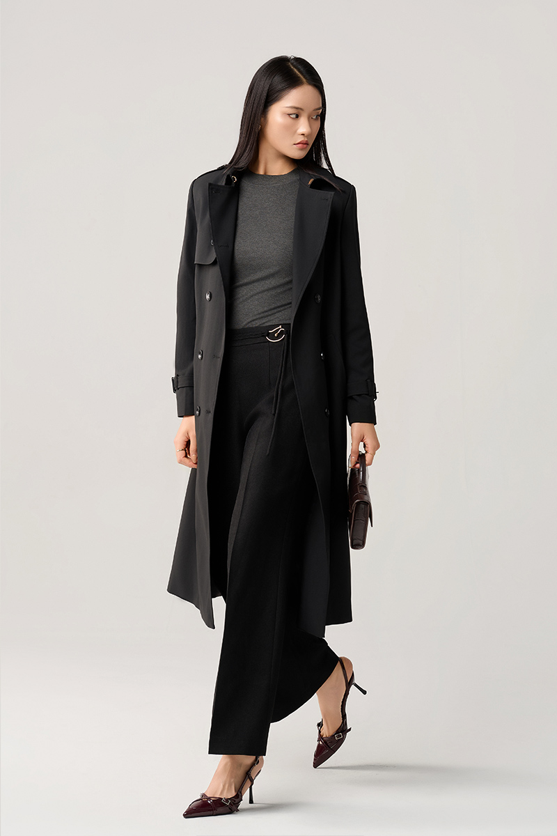 Áo thun xám ôm gọn làm lớp nền trung tính, bên ngoài là chiếc áo khoác đen dáng dài phom chuẩn. Quần đen ống suông cạp cao giúp cân bằng tổng thể, sự phối hợp chặt chẽ giữa phom dáng và gam màu mang đến vẻ đẹp hiện đại và thời thượng. ẢNH: LEIKA