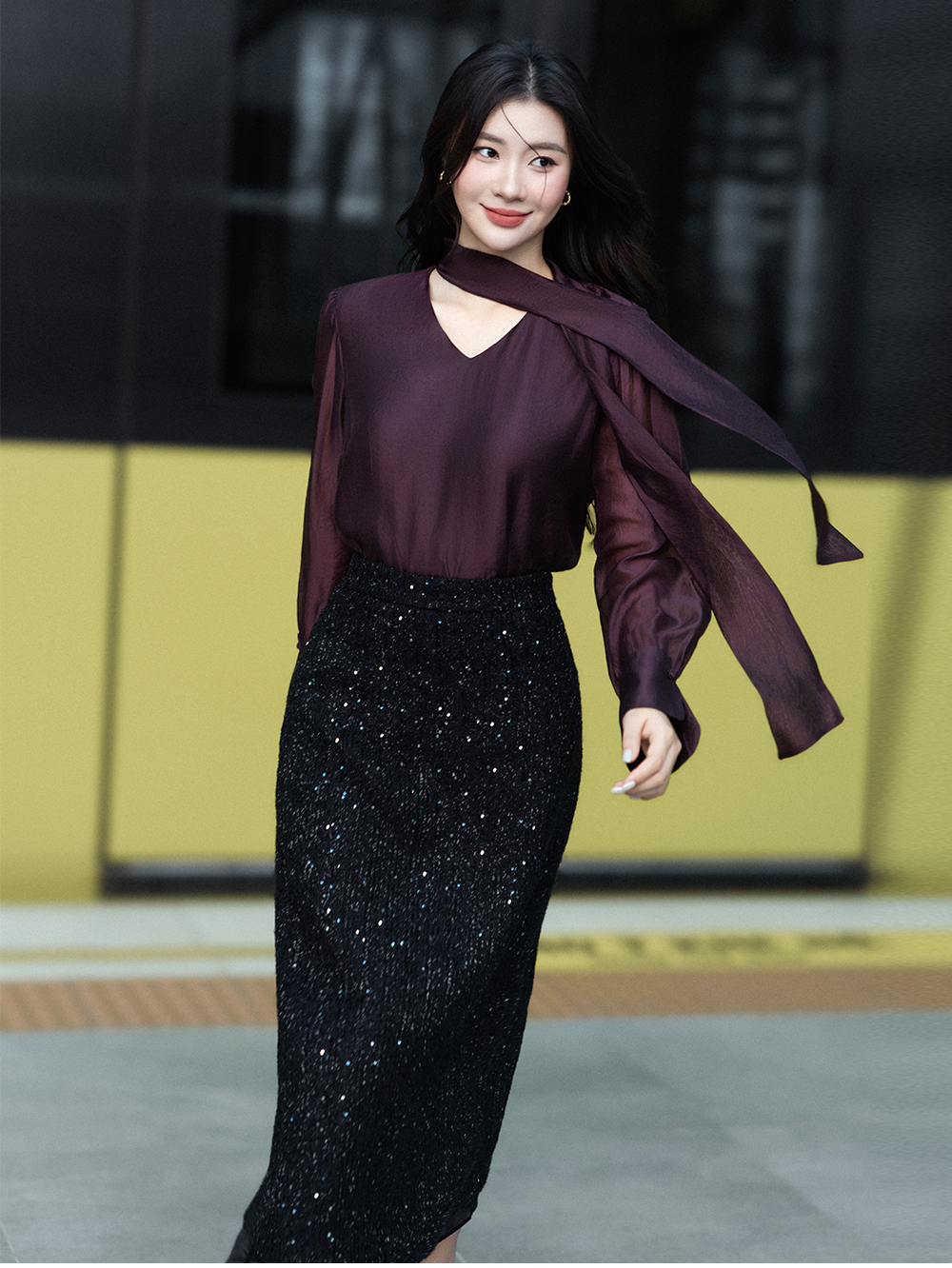 Chân váy sequins mang đến không khí mùa lễ hội rộn ràng, cổ điển nhưng vẫn thời thượng khi kết hợp cùng áo kiểu vải tơ màu tím đậm. ẢNH: NEM FASHION