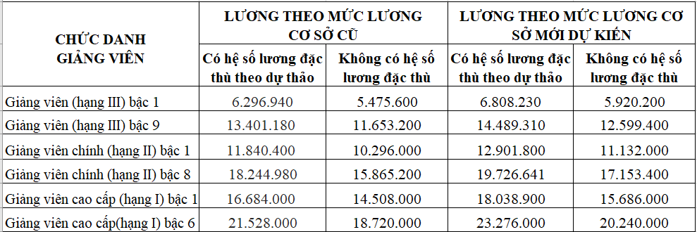 So sánh lương của chức danh giảng viên (bậc cao nhất và bậc thấp nhất) được tính theo mức lương cơ sở cũ và mức đề xuất mới