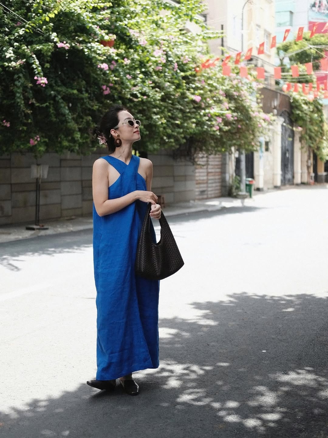 Khi rời khỏi những bản phối thanh lịch, gam màu này linh hoạt hơn trong các thiết kế thoải mái. Đầm maxi dáng suông hoặc quần ống rộng sắc cô ban phối cùng áo sát nách đen ôm nhẹ đem lại diện mạo hiện đại. Sự tương phản giữa xanh và đen giúp bộ trang phục trông rõ nét hơn. ẢNH: @CATRICHMAUXANH