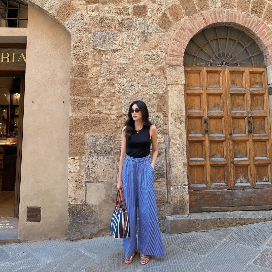 Quần ống rộng kẻ sọc sắc cô ban khi phối cùng áo sát nách dáng ôm và phụ kiện tối giản tạo cảm giác gọn gàng. Bản phối này thiên về sự nhẹ nhàng nhưng vẫn đủ nổi bật nhờ tông màu tươi sáng. ẢNH: @HATANGTHANH