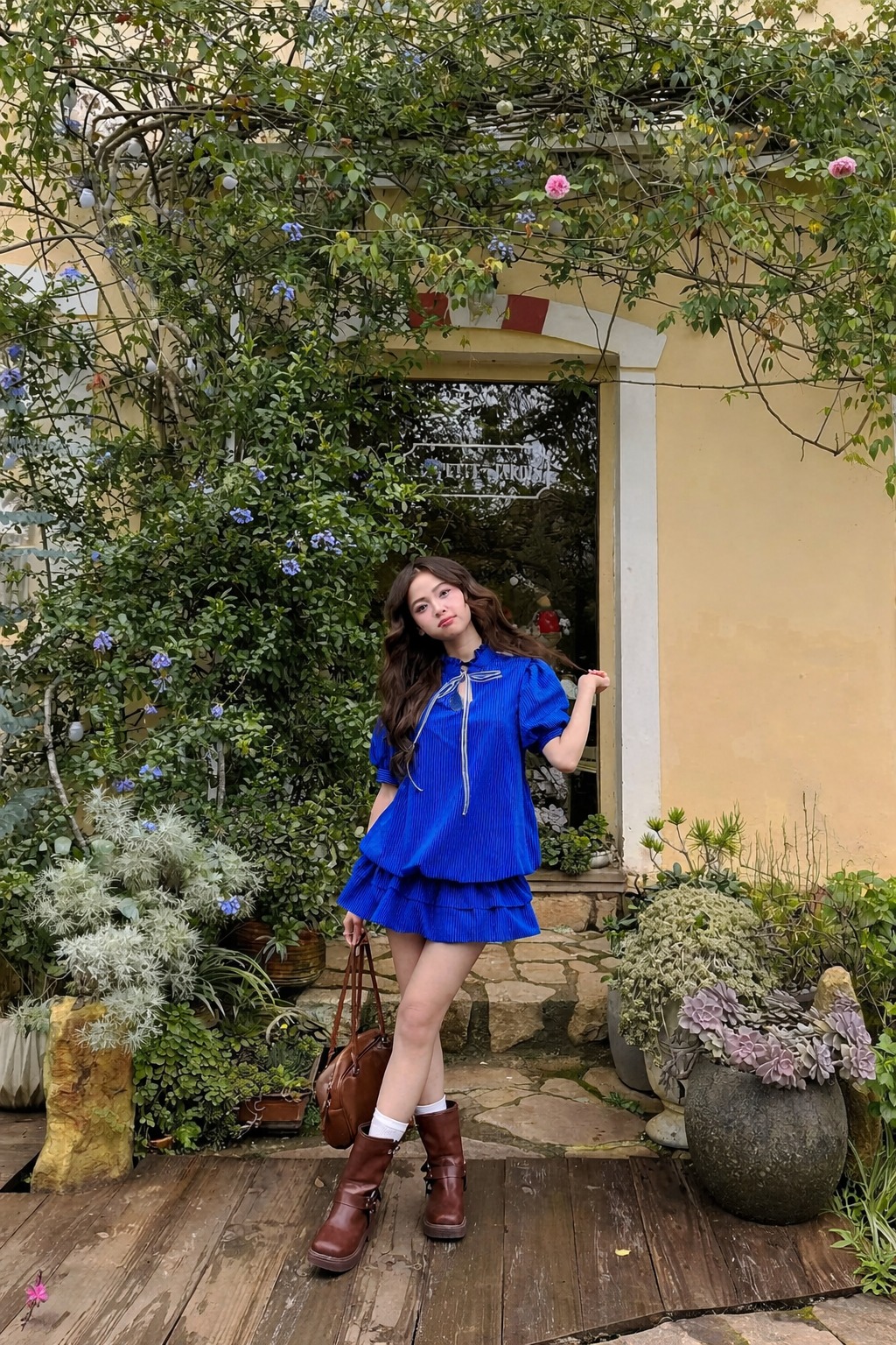 Thiết kế xanh cô ban kết hợp giày bốt da nâu cổ lửng tạo cảm giác nữ tính pha chút vintage cổ điển. ẢNH: @THUYTHNG__
