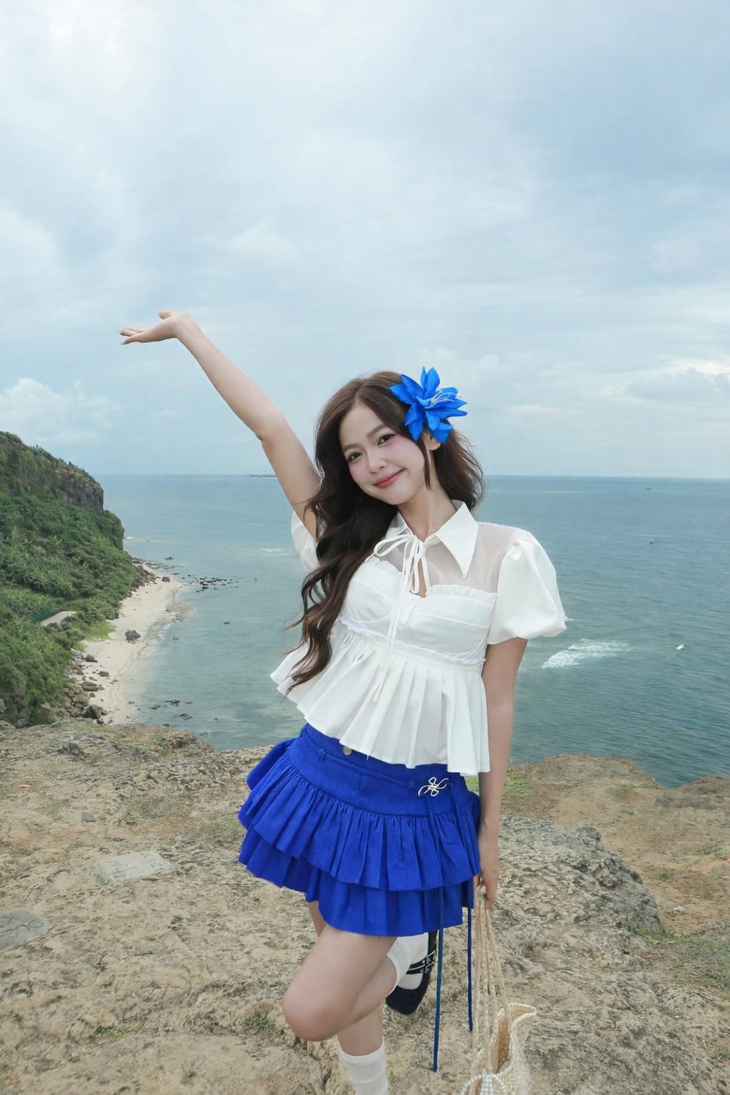 Chân váy xanh cô ban phối cùng áo trắng cổ nơ tạo cảm giác nhẹ nhàng. Phần chân váy bèo nhún xếp tầng sắc xanh nổi bật thu hút thị giác, phù hợp những buổi gặp gỡ hoặc dạo phố. ẢNH: @THUYTHNG__